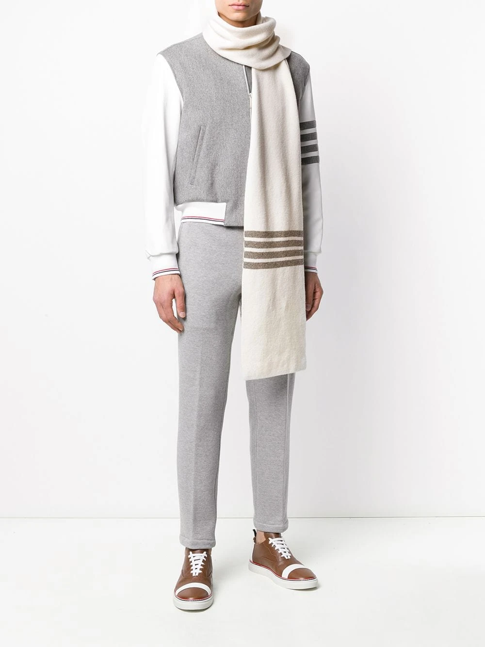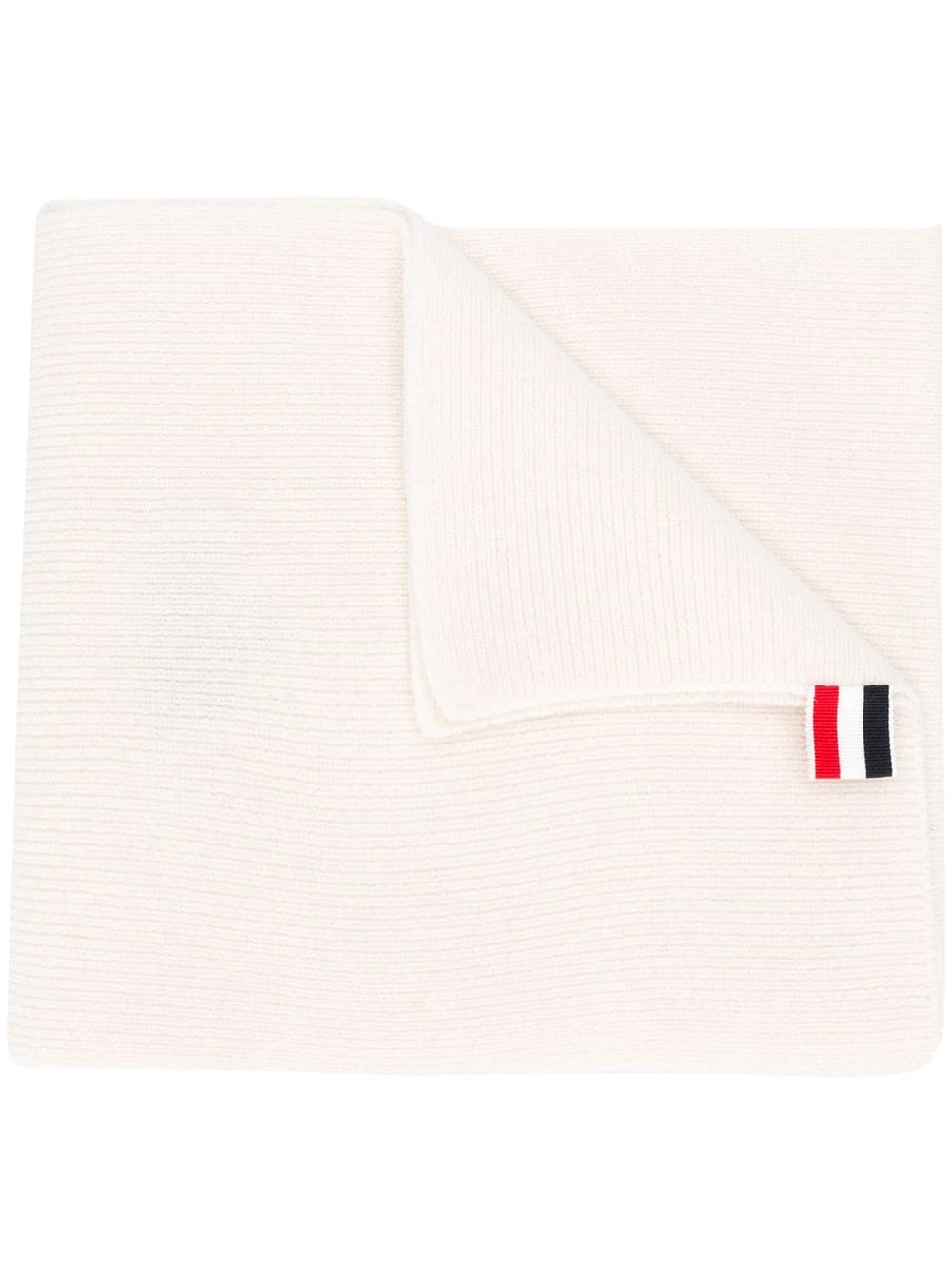 Wrap up. The merino wool means that this Thom Browne scarf will more than keep you warm enough. The stripe details and sophisticated style are very welcome bonuses. Featuring a ribbed design, a striped pattern and a signature three stripe detail.