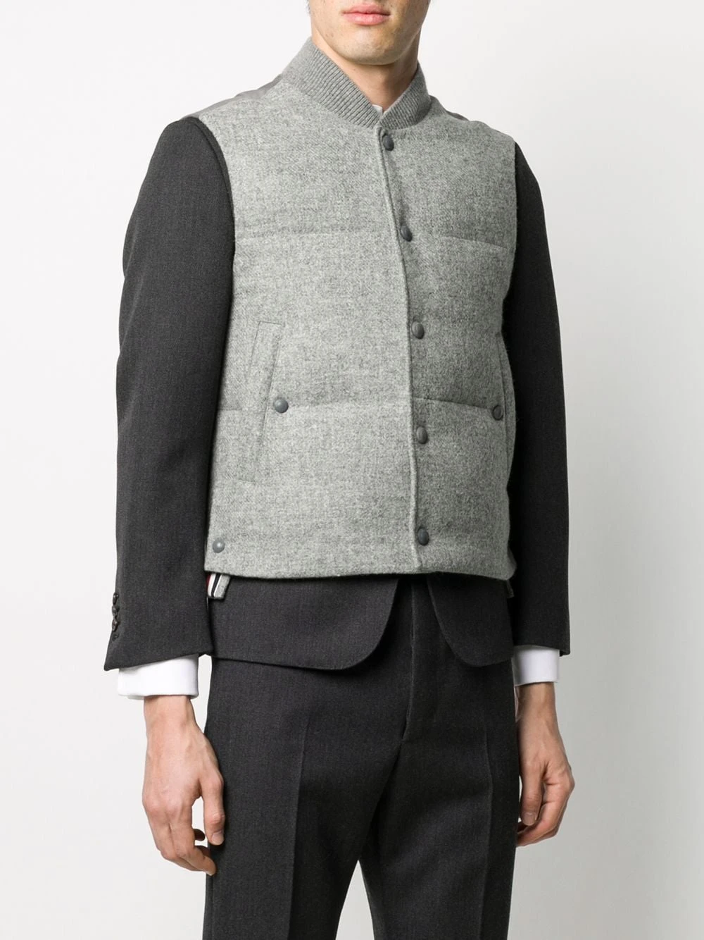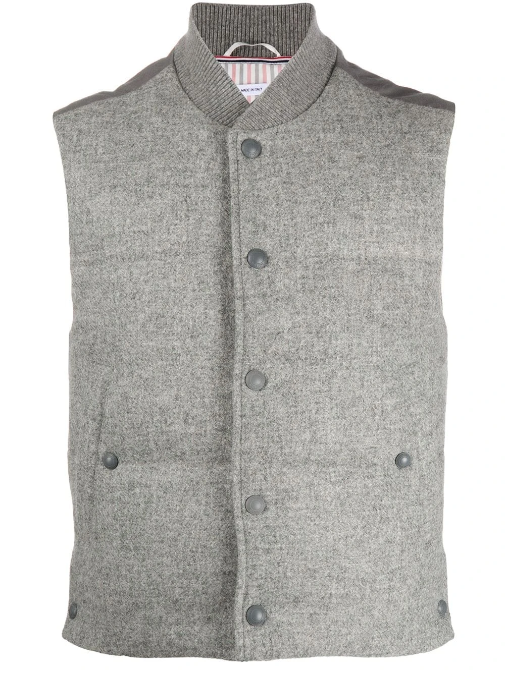 Sometimes a sleeveless jacket is the only outwear you need. This snap-button padded gilet from Thom Browne will keep you warm without making you feel like you’re overheating. It’s a delicate balance but this down-filled design manages it. Featuring a ribbed collar, a padded interior, a sleeveless design, front buttoned pockets and an RWB stripe tab.