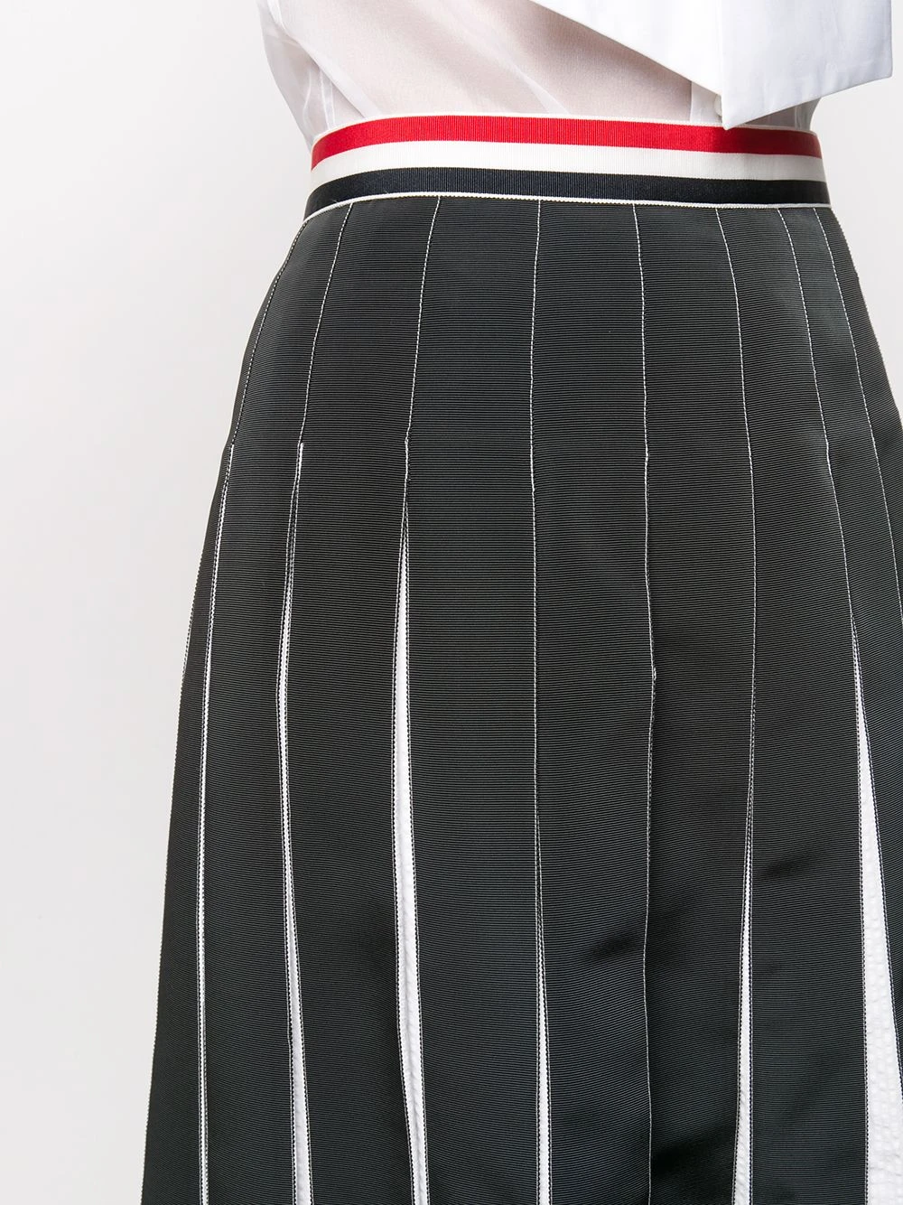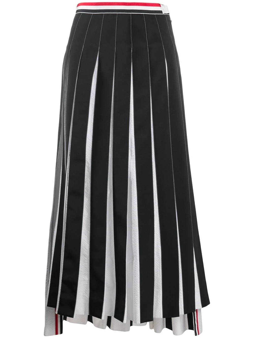 Walk into your next business meeting in confidence and style with this RWB-detail ankle-length skirt from Thom Browne. Fully pleated, it will guarantee an elegant silhouette. All eyes on you.