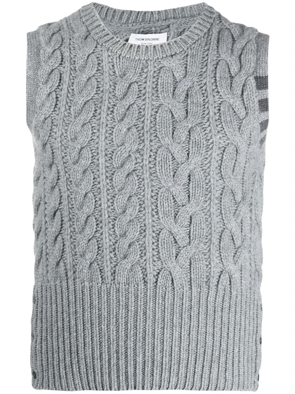 And you thought sweater-vests were just worn by Chandler Bing in Friends? How wrong you were. Crafted from cashmere, this Aran cable knit vest from Thom Browne is detailed with the signature 4-Bar Stripe to the left arm cuff to make it instantly distinguishable. Those who know, will know.