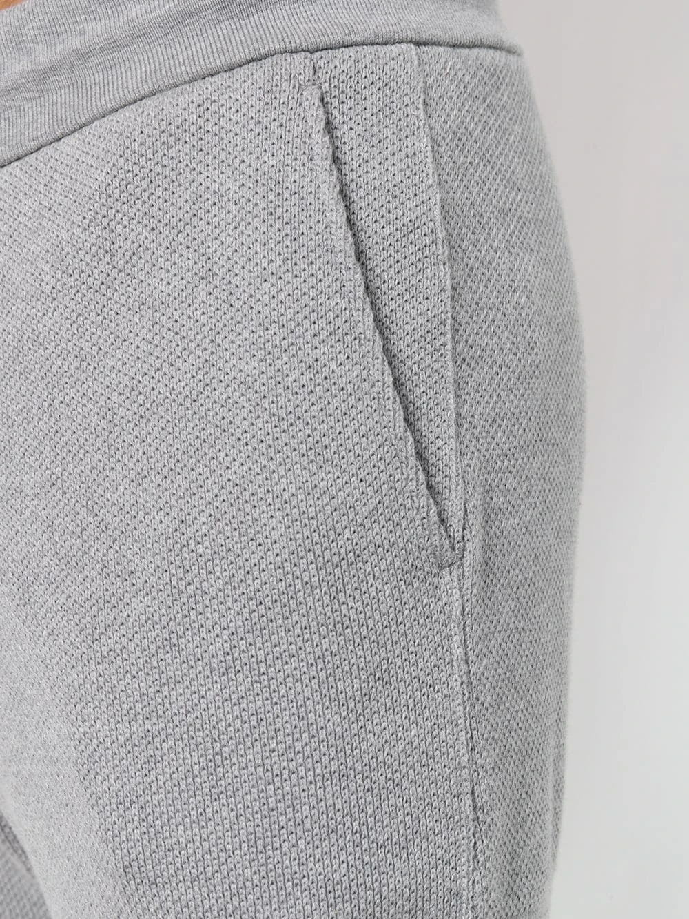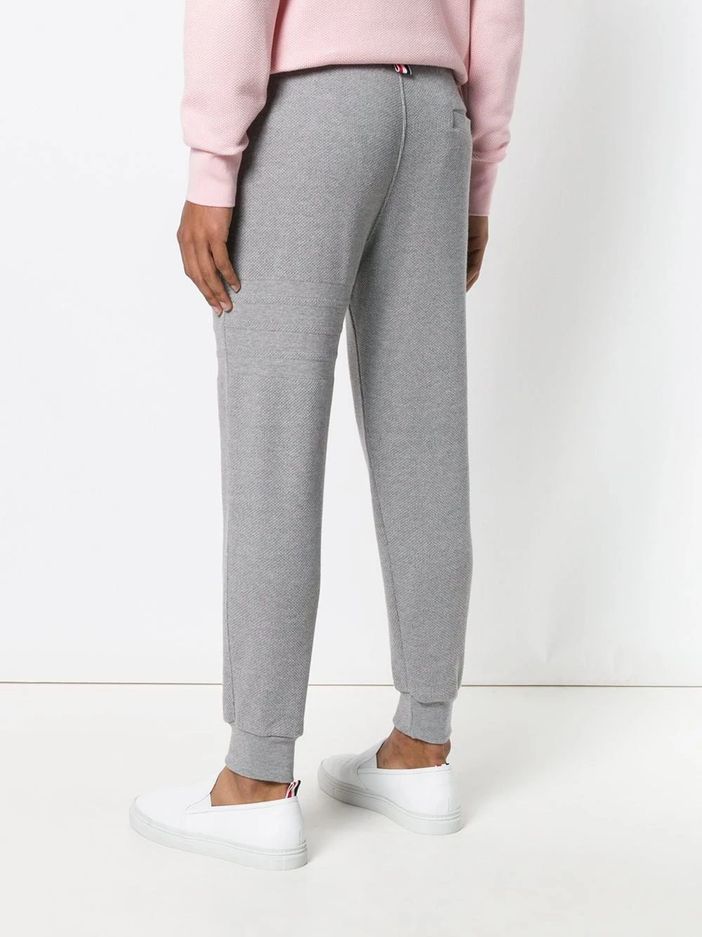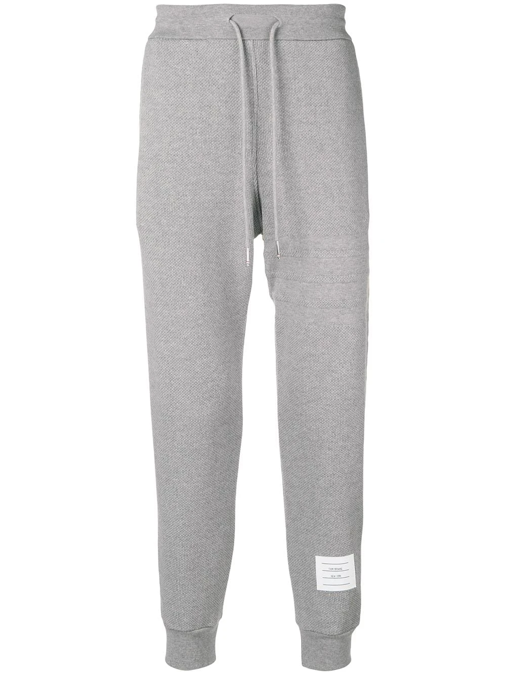 Grey cotton 4-Bar Honeycomb Piqué Sweatpant from Thom Browne featuring a mid rise, an elasticated drawstring waist, a slim fit, a tapered leg, gathered ankles, side pockets, a signature tri-colour striped trim, a back welt pocket and a logo patch at the left ankle.
