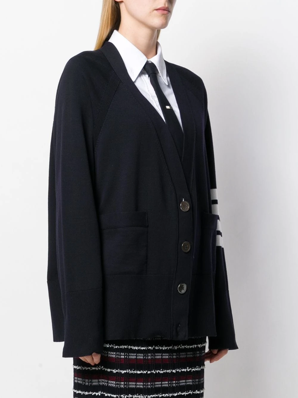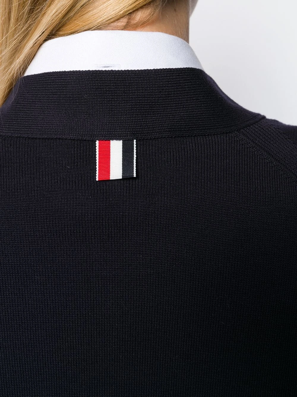 A wardrobe of reimagined – but never boring – classics, Thom Browne’s latest collection takes uniform dressing to chic new heights with designs like this navy cotton 4-bar raglan sleeved V-neck cardigan. Featuring elongated sleeves, a v-neck, a front button fastening, a ribbed hem and cuffs, two front patch pockets, a signature label tag at the back, a signature 4-bar motif at the sleeve and a signature striped print at the fastening.