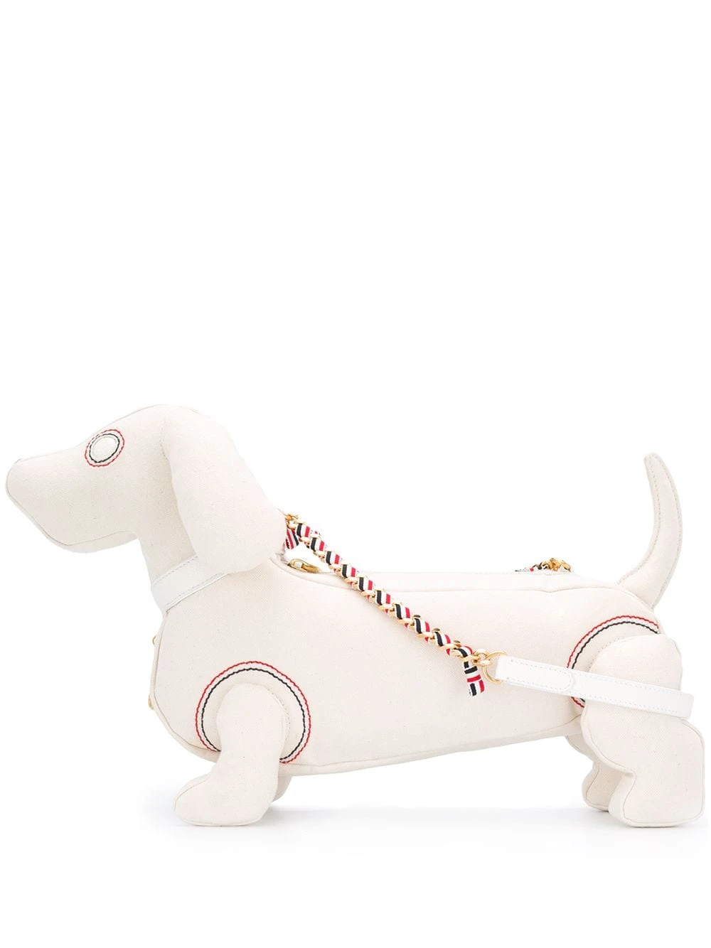 Take your bag-game to the next step with this cotton Hector Bag from Thom Browne. Prepare for all the looks. You’re winning. Featuring shoulder strap, a hanging leather tag, chain-link lead, a top zip closure, an internal zipped pocket, an internal logo patch, gold-tone hardware, a gold-tone bone charm with an engraved logo, a tricolour grosgrain tab and a striped lining.