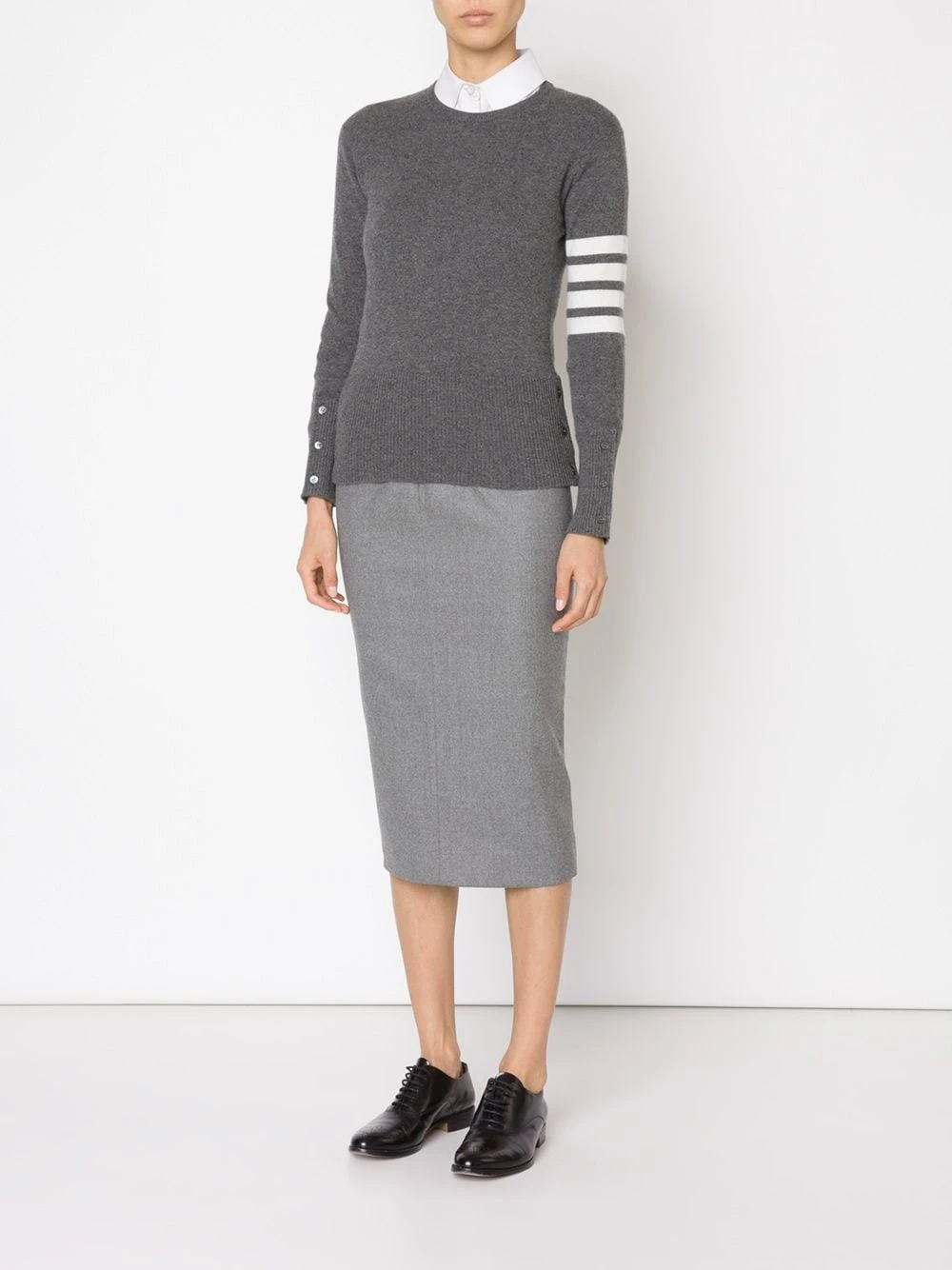 As renowned for his beloved knitwear as he is for his boundary-pushing tailoring, this knitted cardigan finds Thom Browne editing a familiar favourite with more athletically-inclined detailing. Crafted in the United Kingdom from soft medium grey cashmere, this elegant jumper features a ribbed crew neck, long sleeves, button cuffs, a ribbed hem and cuffs, 4-bar stripes at the sleeve, red, white and blue grosgrain detailing and back yoke tab and side buttoned slits.