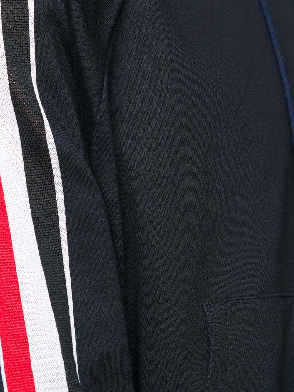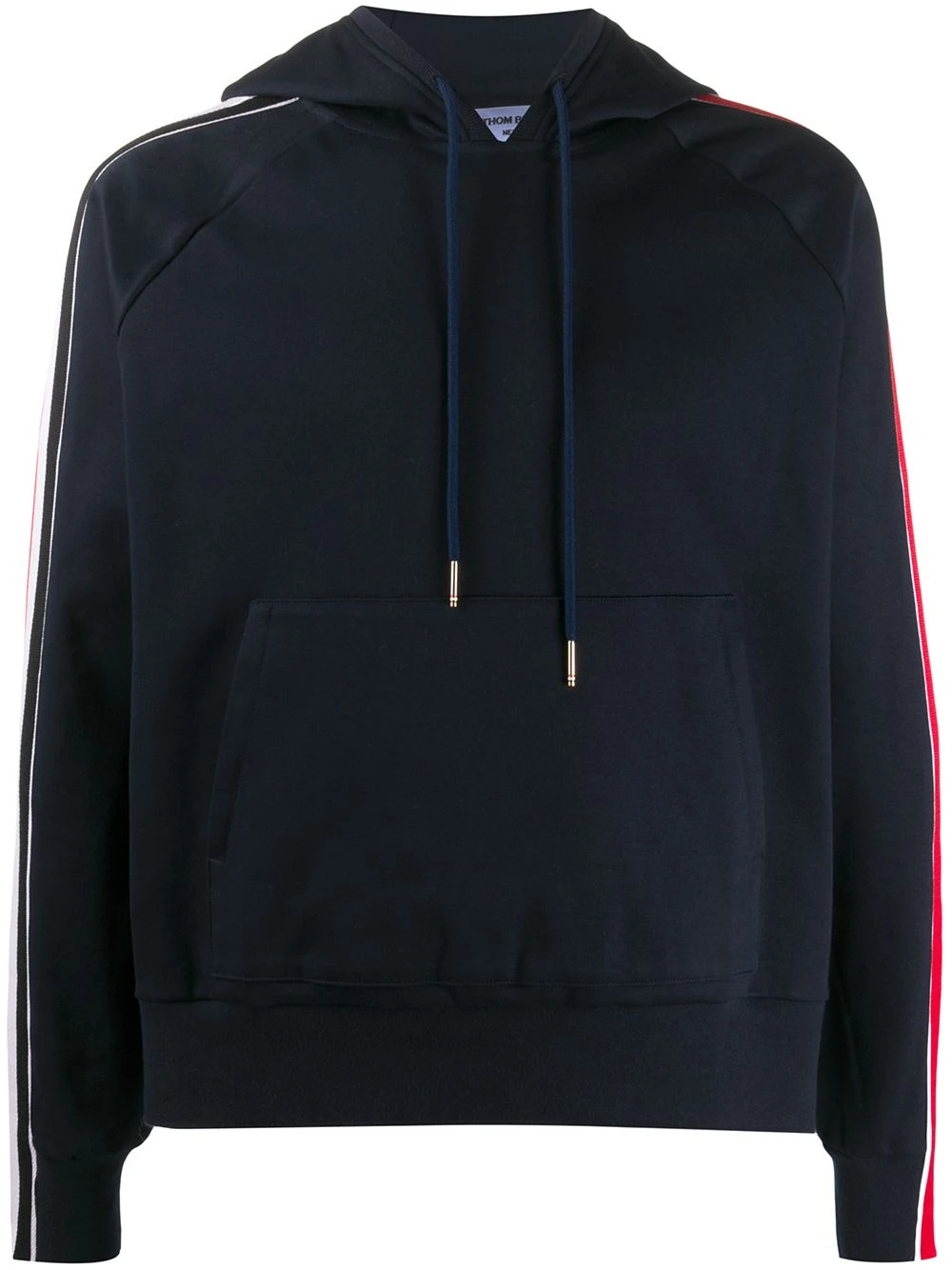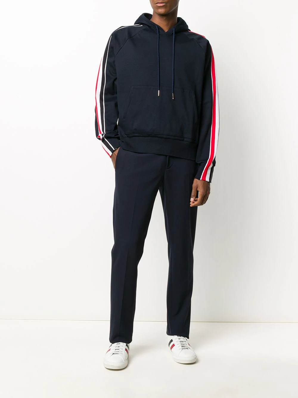 Thom Browne’s newest edit captures the immaculate craftsmanship and minimalist designs that have come to define the American label, as seen with this navy blue cotton interlock RWB stripe hoodie featuring a hood with drawstring tie fastenings, long length raglan sleeves with a stripe detail to the side and a kangaroo pocket.
