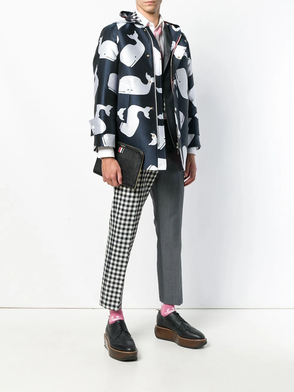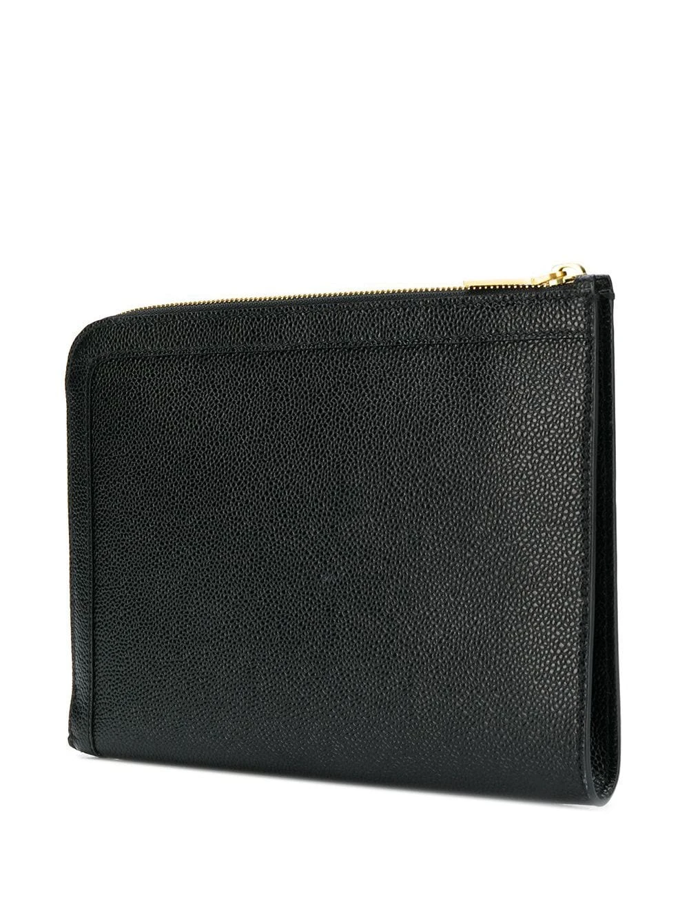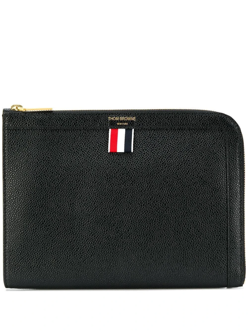 Banish those unsightly bulging pockets once and for all with this mini gusset folio from Thom Browne. Made from black pebbled leather, this slimline accessory is perfect for transporting small essentials in the most stylish way possible. Featuring a front embossed logo stamp, a signature tri-colour striped tab, an all-around zip fastening, a main internal compartment, and a striped lining.