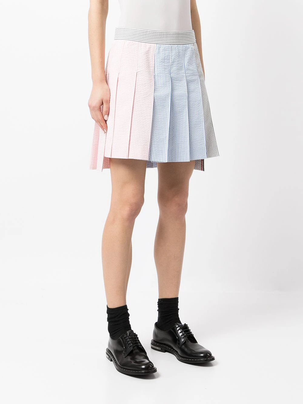 Multicolour panels add a playful touch to this pleated skirt from Thom Browne. This cheerful look is further enhanced by the piece’s all-over striped print.