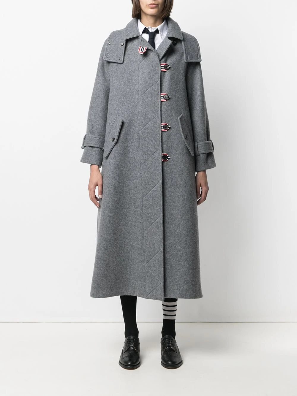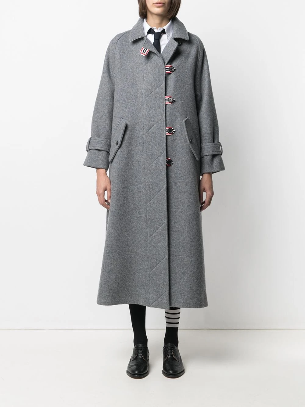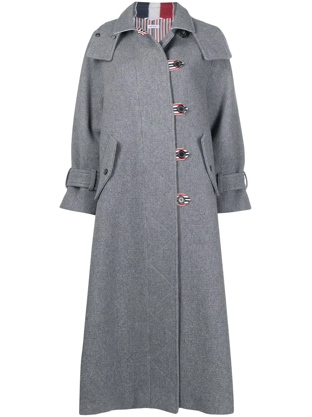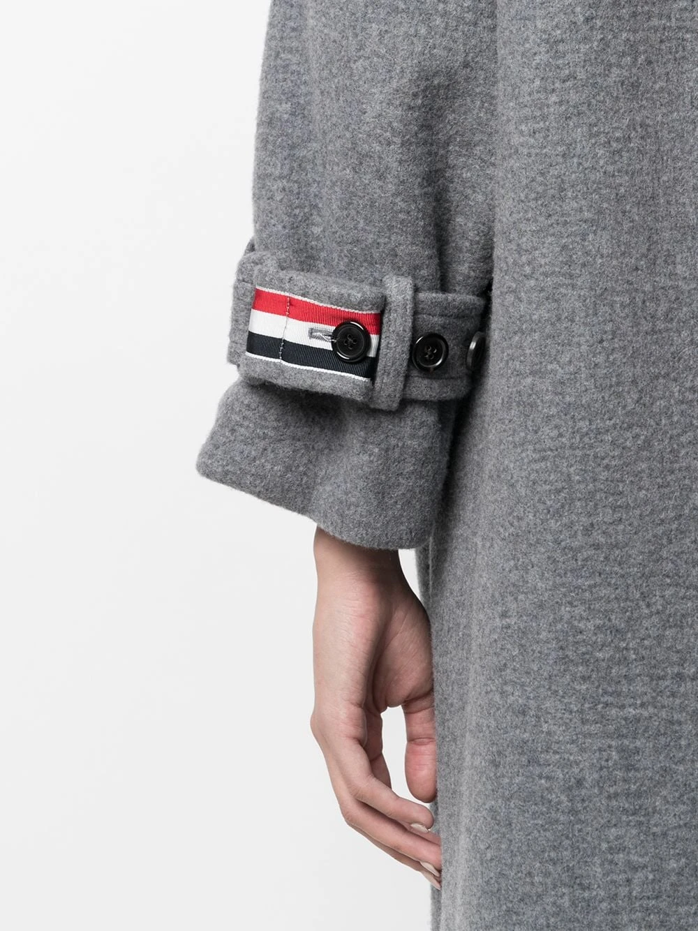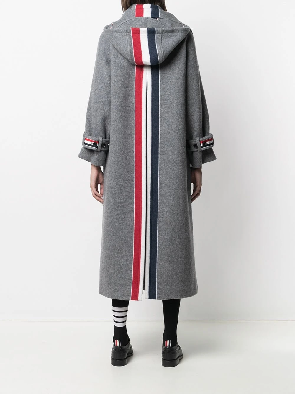 We know it’s not easy to depend on the forecast. So, why not rely on Thom Browne? Constructed from a soft wool and cashmere blend and boasting the iconic RWB stripe, this long duffle coat will answer to your morning doubts.