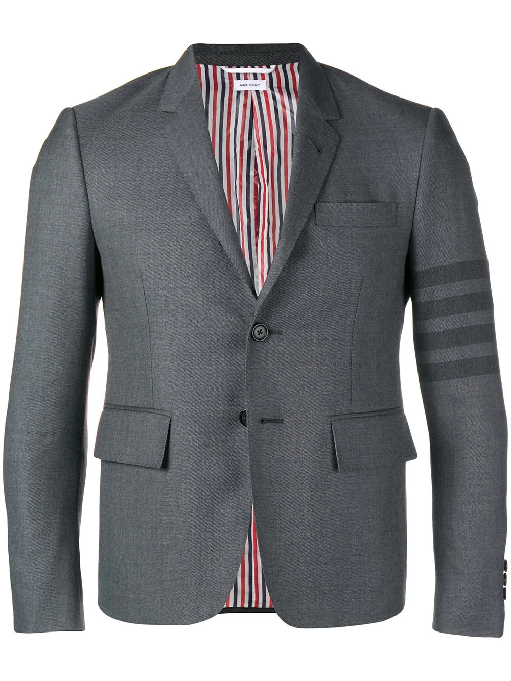 Grey wool-blend 4-Bar High-Armhole Sport Coat from Thom Browne featuring a slim fit, cropped, notched lapels, a front button fastening, a chest pocket, front flap pockets, a double vent to the rear, button cuffs, a signature tri-colour striped trim, a striped lining and four-bar stripes at the sleeve .
