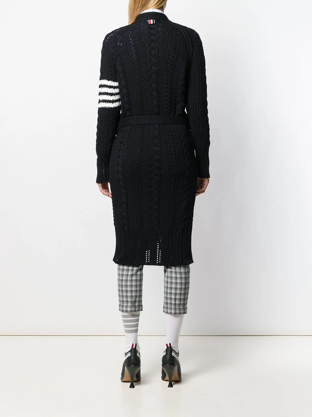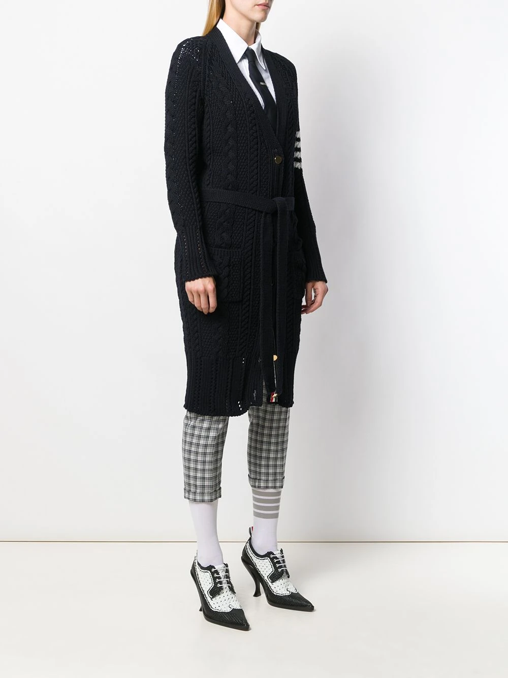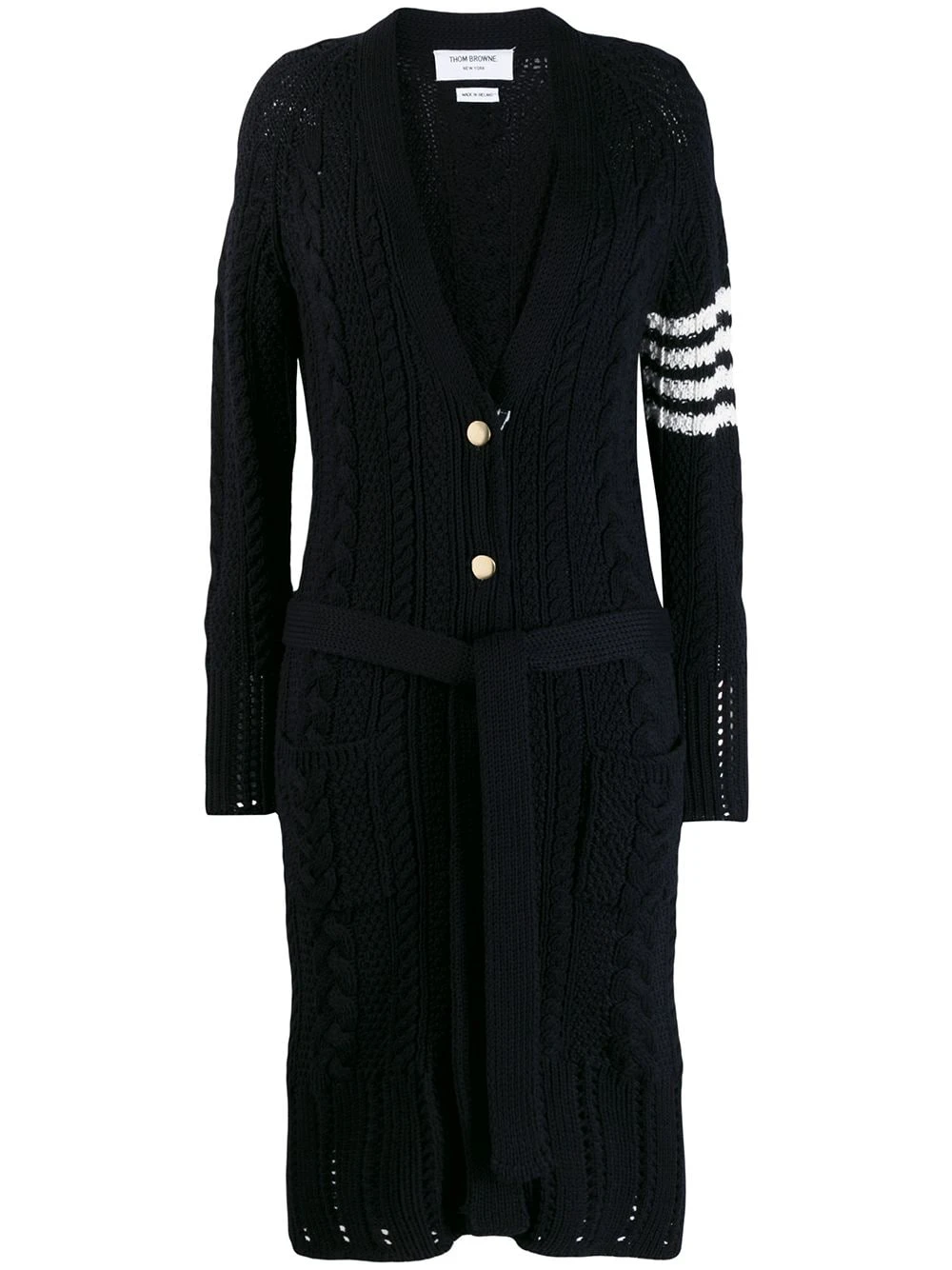 Stay cosy in style. This 4-Bar Thom Browne cardi-coat showcases the brand’s signature 4-Bar stripe for a preppy look. Wrap up warm! Featuring a v-neck, long sleeves, a front button fastening, two front pockets, a mid-length, an aran knit, a signature grosgrain loop tab and a 4-Bar stripe.