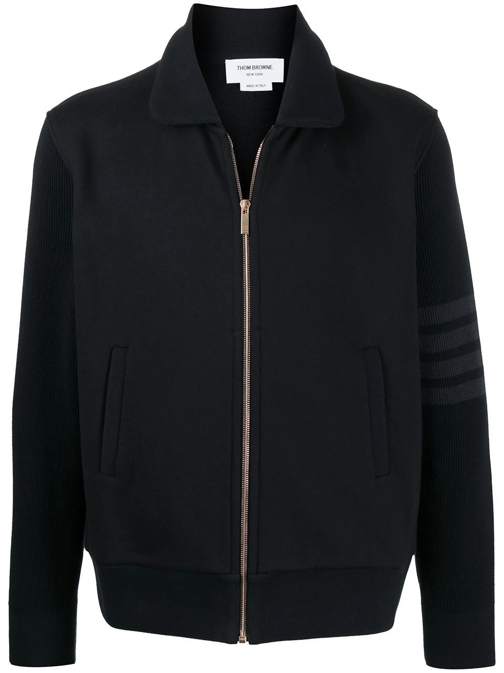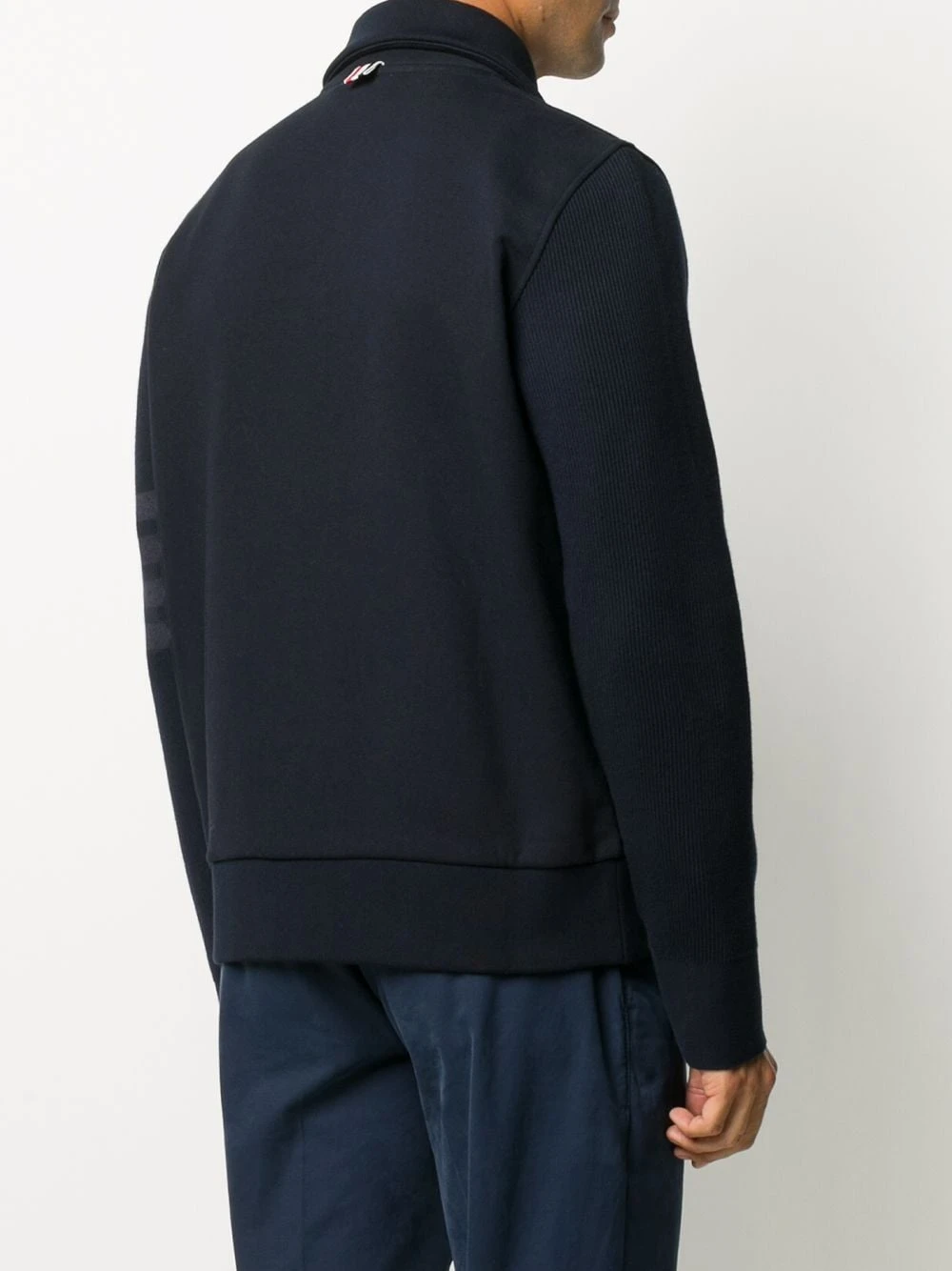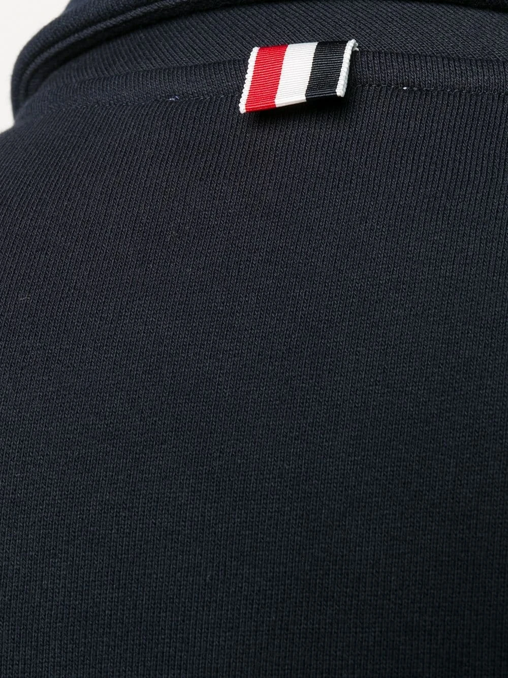 Dark-blue cotton 4-Bar zip-up cardigan from THOM BROWNE featuring knitted construction, signature grosgrain loop tab, signature 4-Bar stripe, ribbed-knit edge, classic collar, front zip fastening, long sleeves and two side slit pockets.