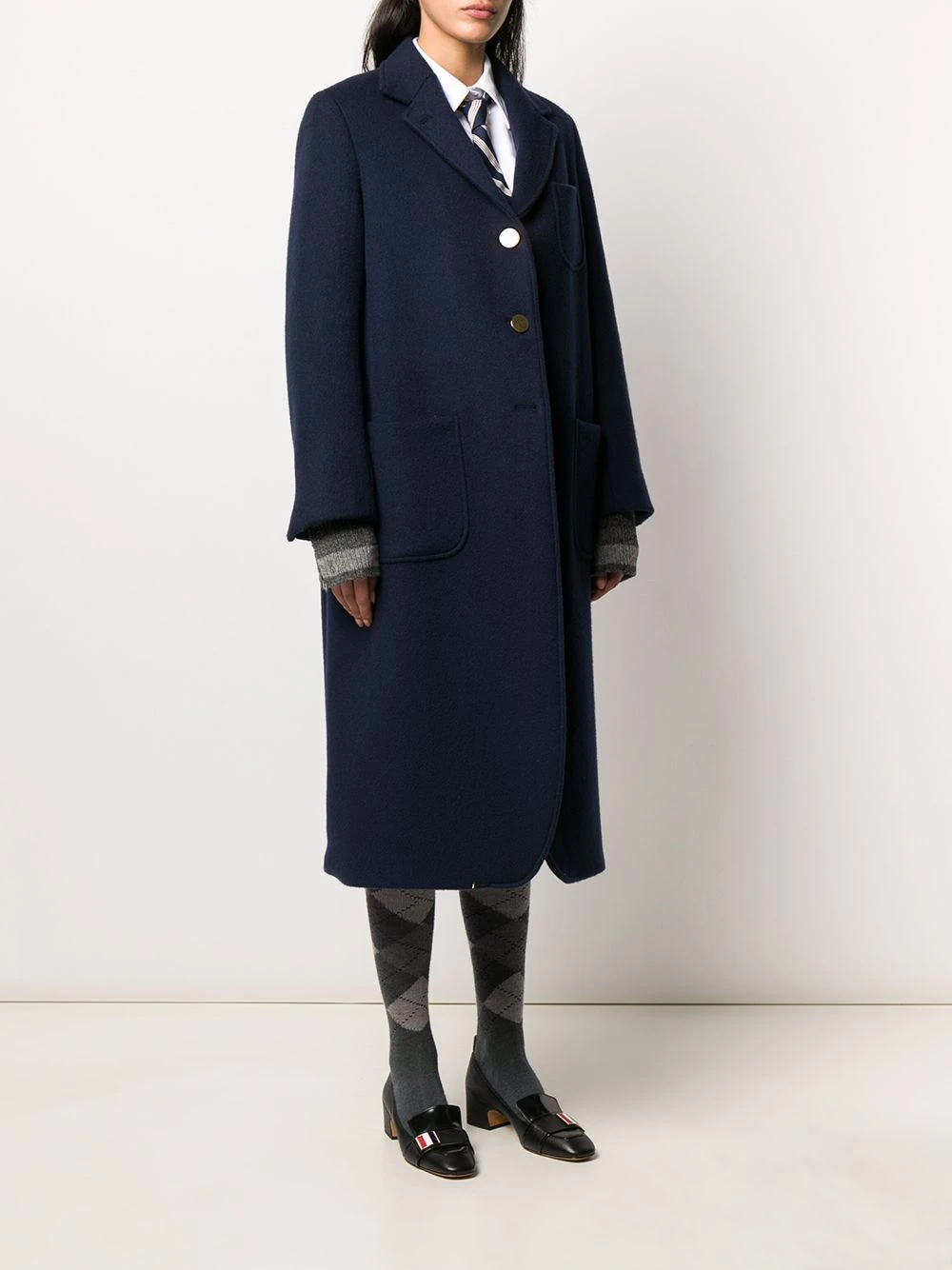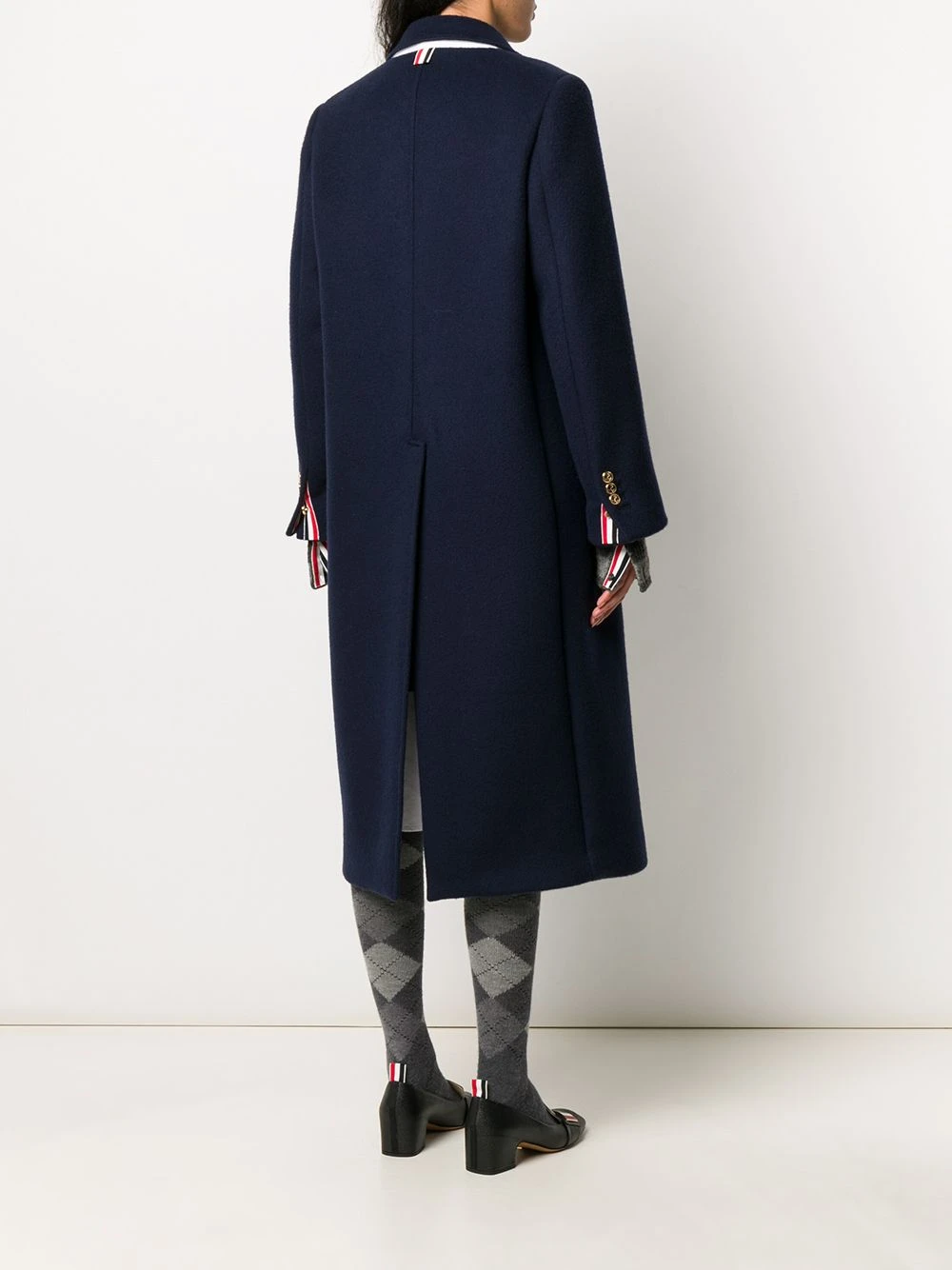 Take note, you can have anything you want in life if you dress for it. Made from navy cashmere, this unconstructed elongated sack overcoat in military weight cashmere from Thom Browne is a great example of that. Edith Head sure knew best. Featuring peaked lapels, a front button fastening, a chest pocket, two front pockets, long sleeves, button cuffs, a back slit at hem and a tricolour grosgrain tab on the rear.