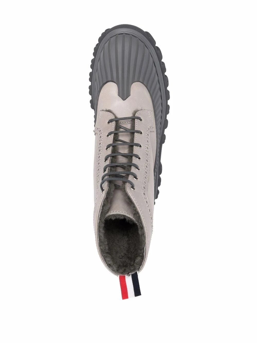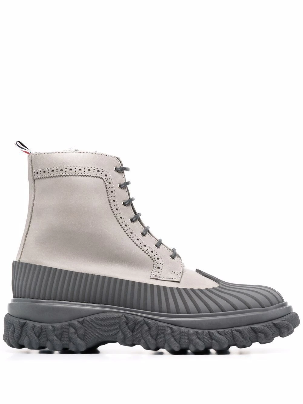A chunky rubber sole takes the focus on these Thom Browne boots, adding a contemporary feel the pair. They are complemented by the ankle-length upper in a soft-grey colourway.
