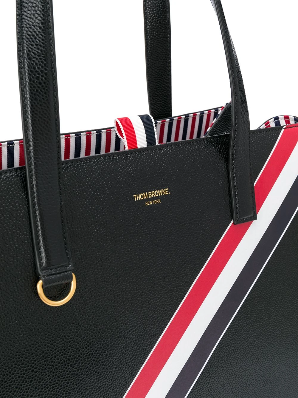 Swap a classic black tote in favour of this fun striped style from Thom Browne. Sporting a pebble grain finish, this black calf leather Mrs Thom tote from is finished with a navy, red and white diagonal striped trim. Embrace stripes. Featuring round top handles, a signature tri-colour striped trim, a front embossed logo stamp, an internal zipped pocket and a pebbled leather texture.