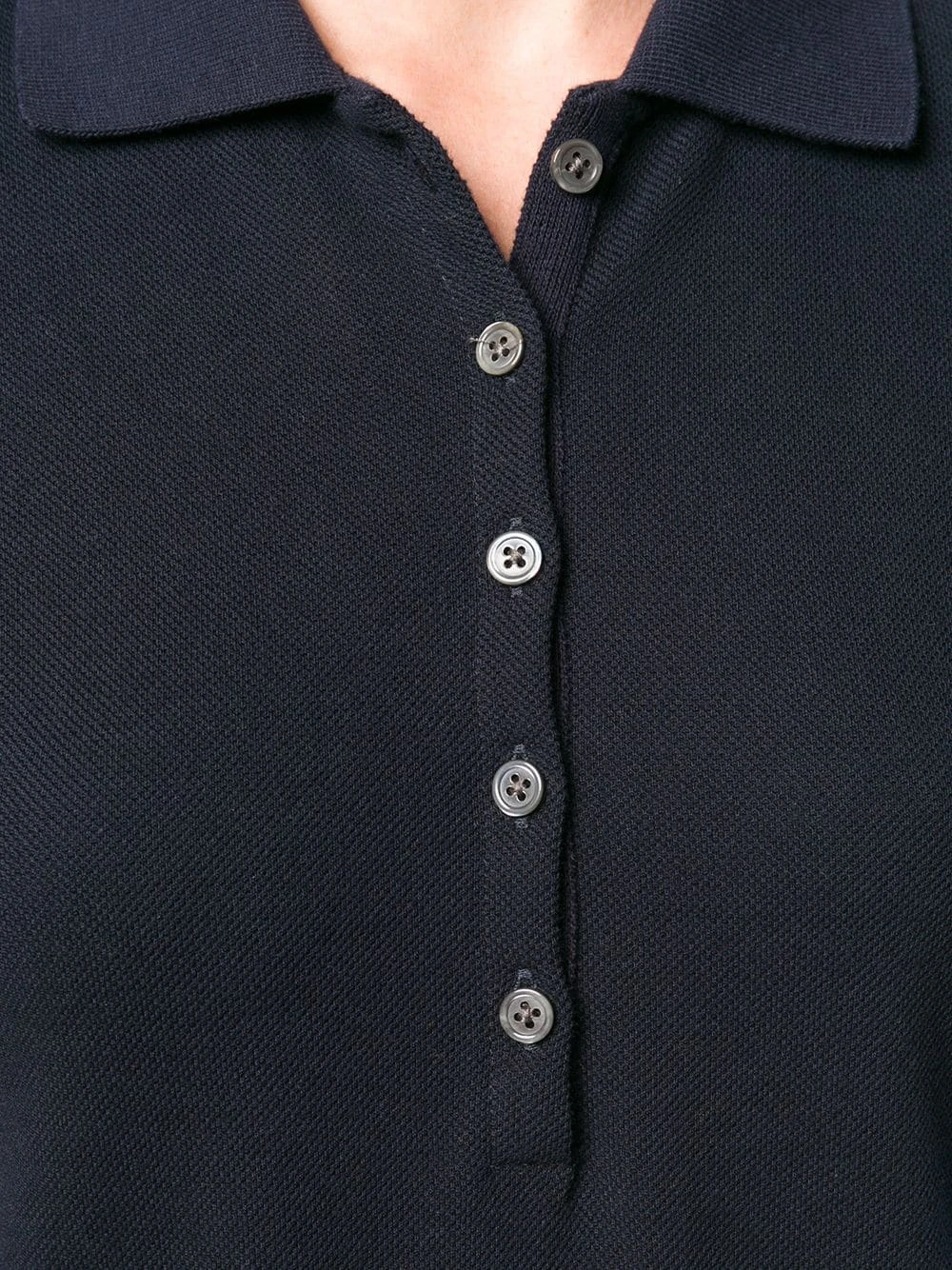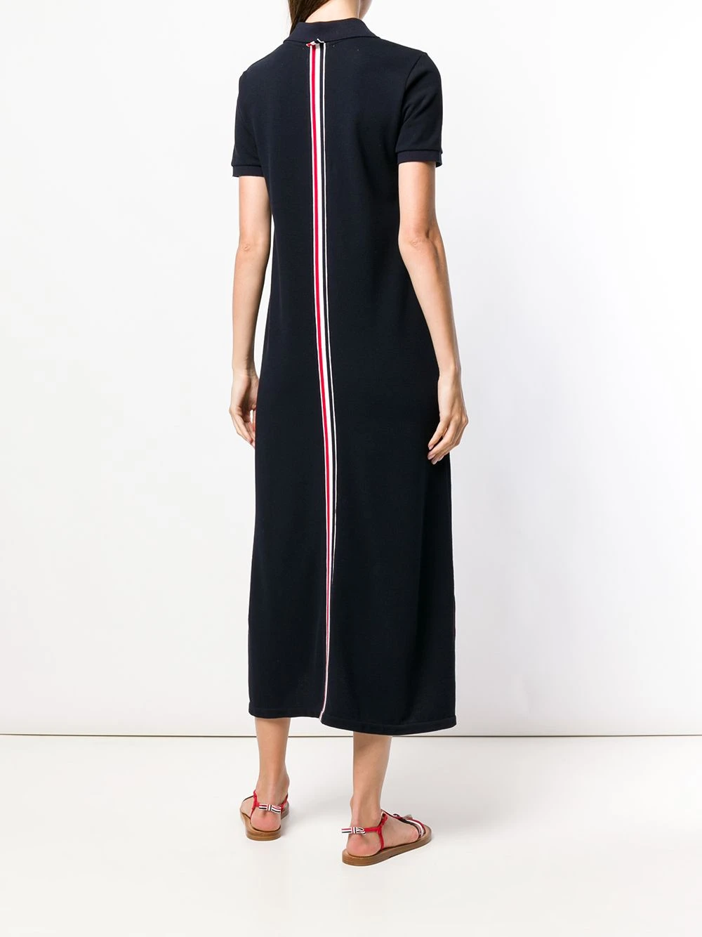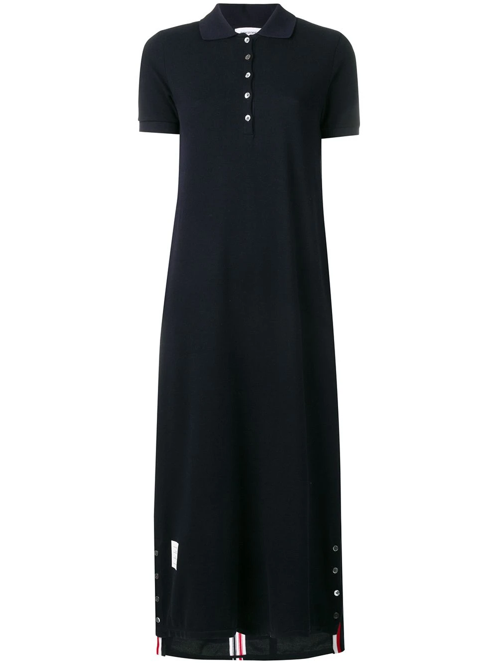 Thom Browne’s newest edit captures the immaculate craftsmanship and minimalist designs that have come to define the American label. Crafted from navy blue cotton, this center-back stripe piqué polo dress features a ribbed polo collar, a front button placket, short sleeves, fitted cuffs, a mid-length, side slits, an asymmetric hem, a tricolour grosgrain tab on the rear, side button fastenings and a signature tricolour striped trim on the back.
