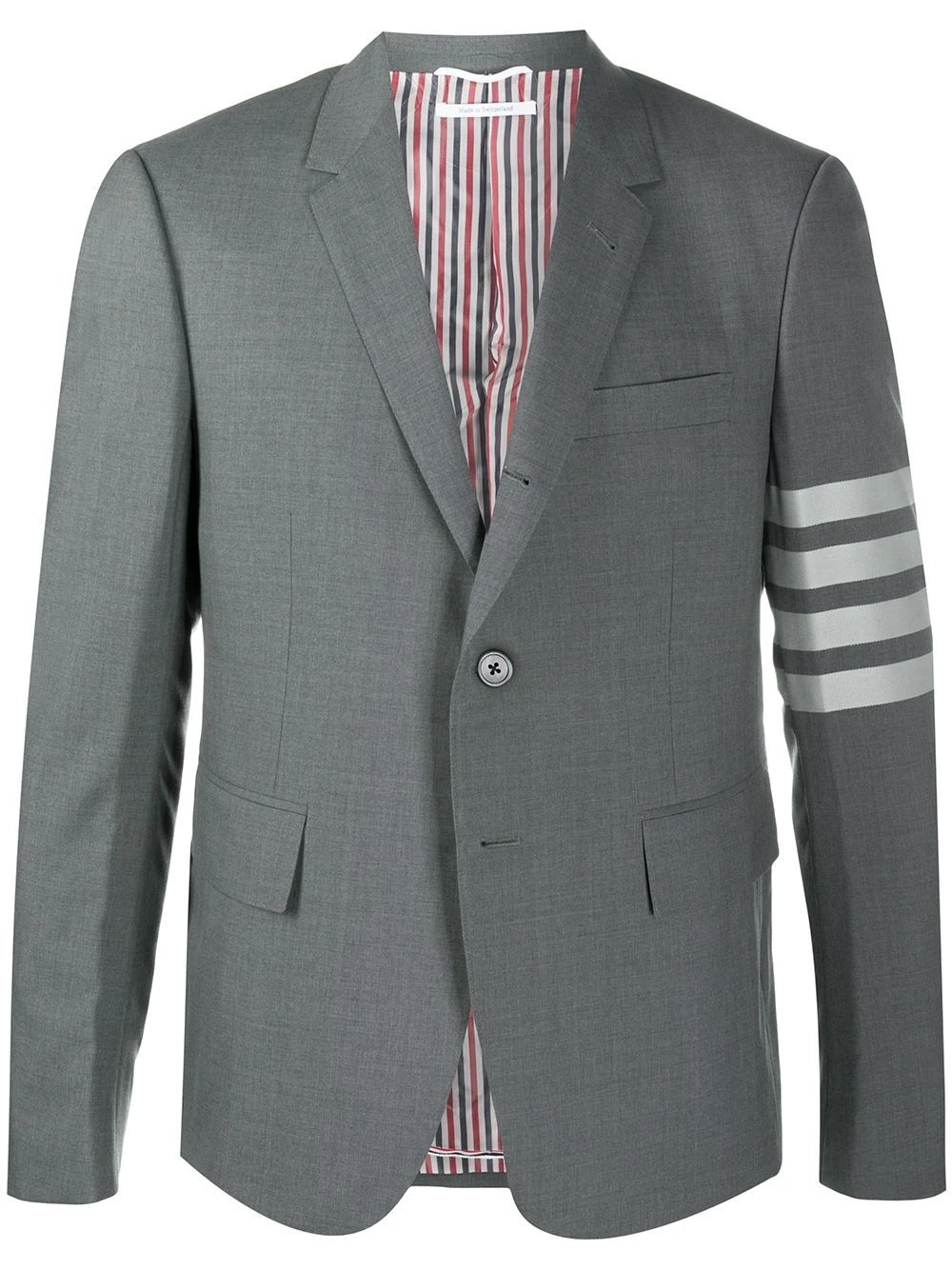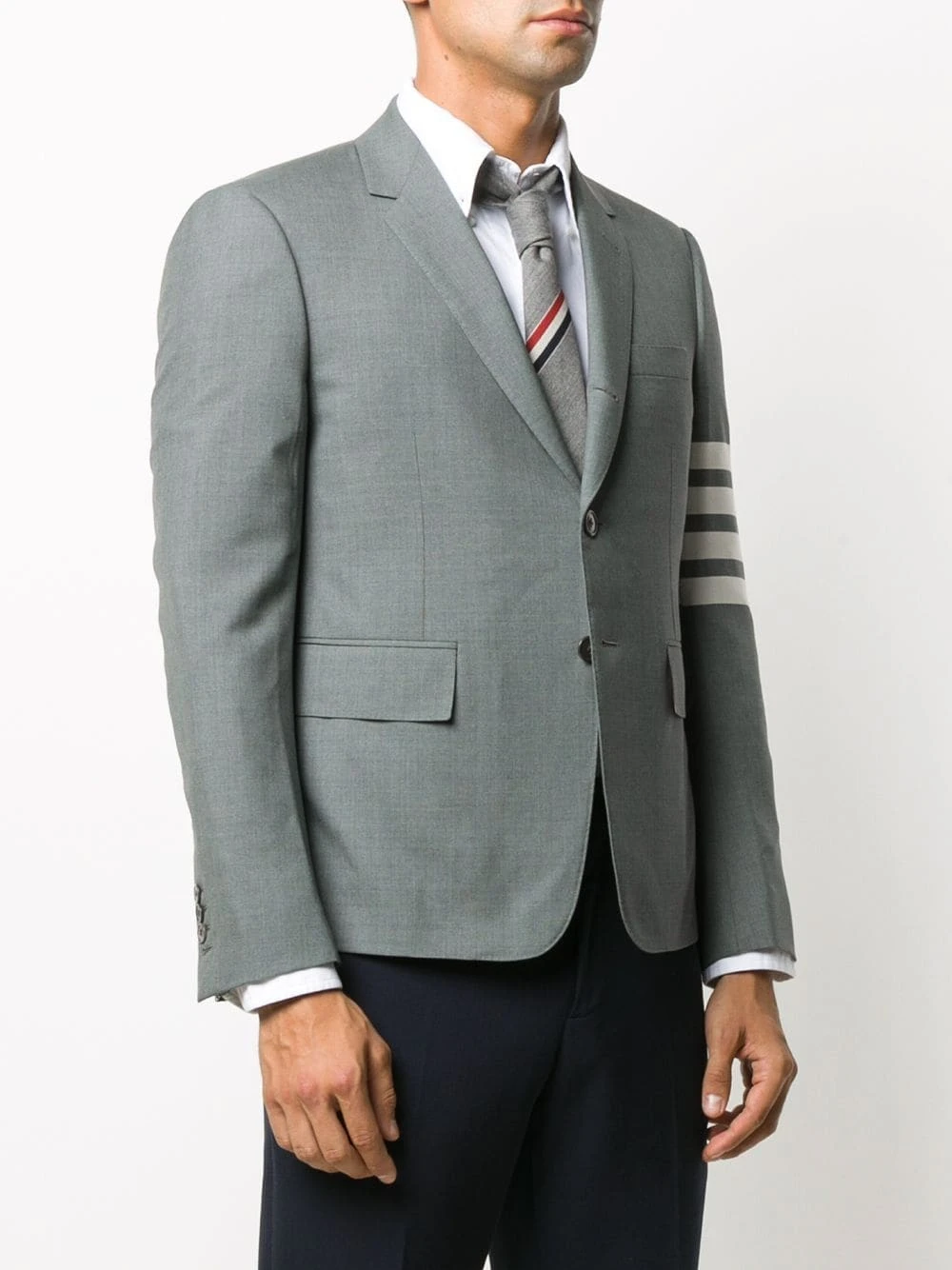Medium grey wool Four-Bar fitted blazer from Thom Browne featuring notched lapels, front button fastening, chest welt pocket, two front flap pockets, buttoned cuffs, straight hem, slightly cropped long sleeves, double vent to the rear and tri-stripe printed lining.