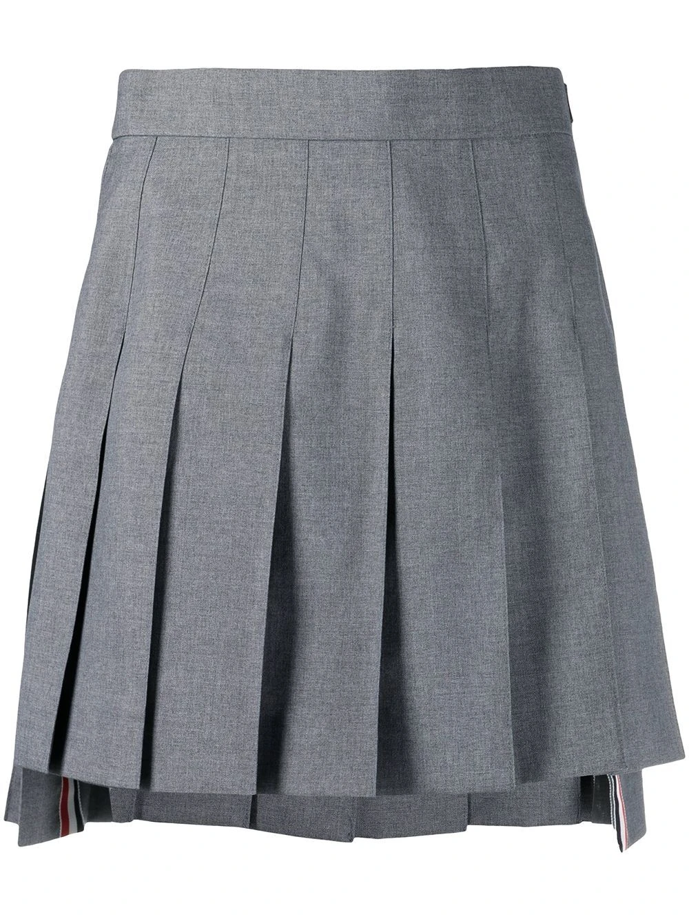 Grey wool-blend pleated mini skirt from THOM BROWNE featuring signature grosgrain loop tab, fully pleated, high waist, thigh-length and step hem.
