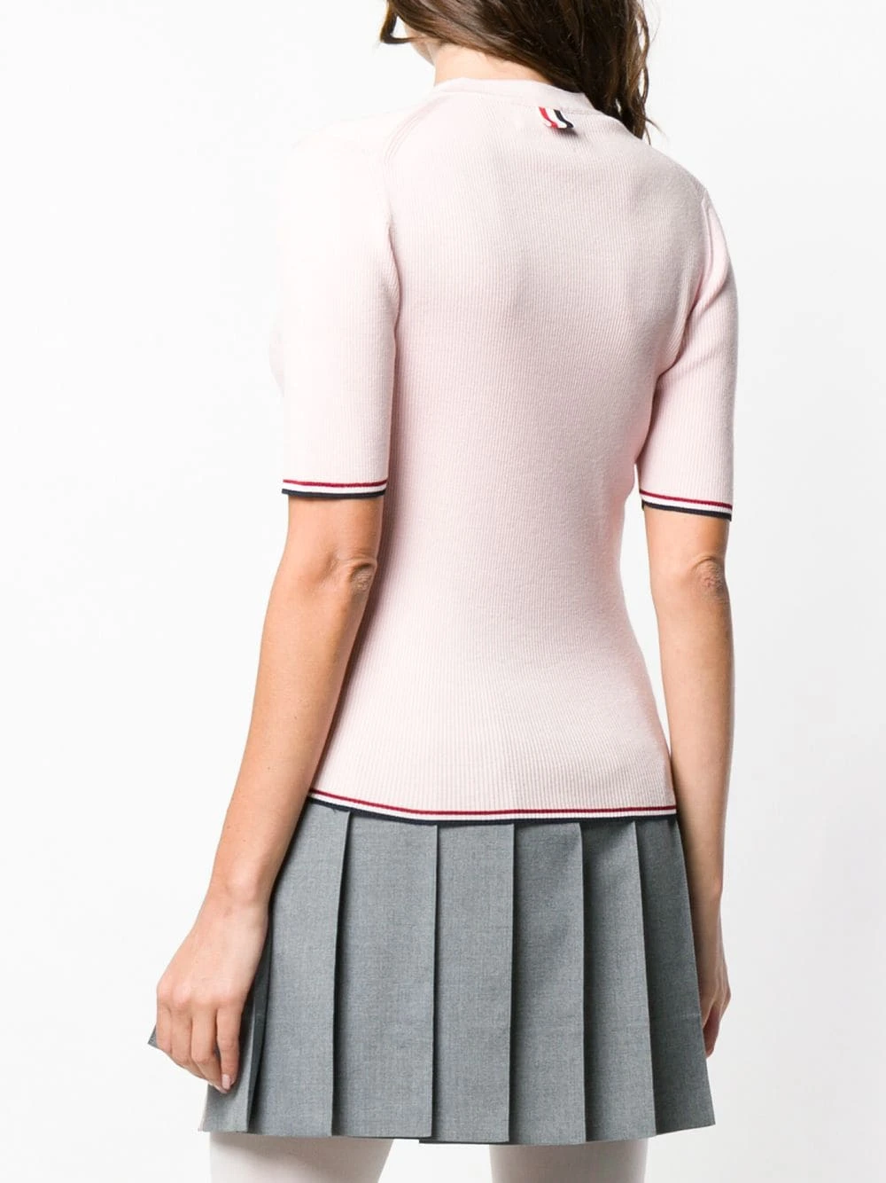 Think pink. Thom Browne is here to add a classic touch to your wardrobe with this RWB-detail knitted T-shirt. Looking good. Featuring a crew neck, a ribbed design, short sleeves, a straight hem, a signature grosgrain loop tab and RWB details.