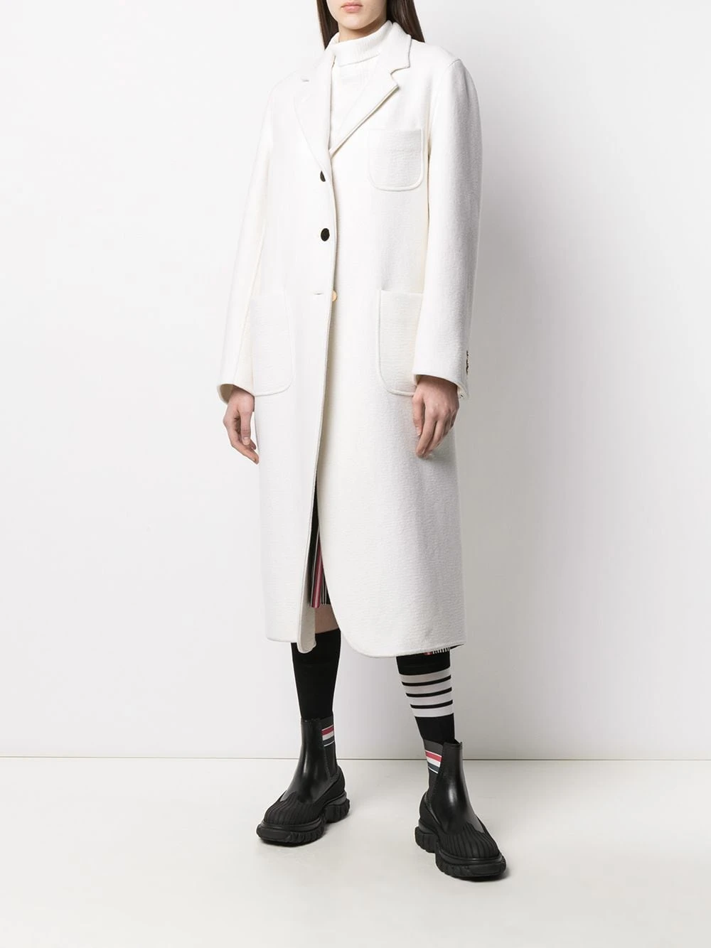 A tailored coat with a signature Thom Browne twist. With a RWB stripe running down the back, this tailored piece is here to stand out and blend in all at once. What more could you want?