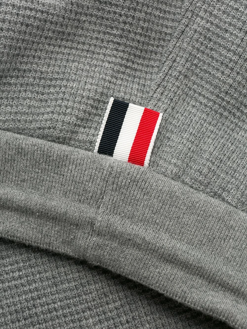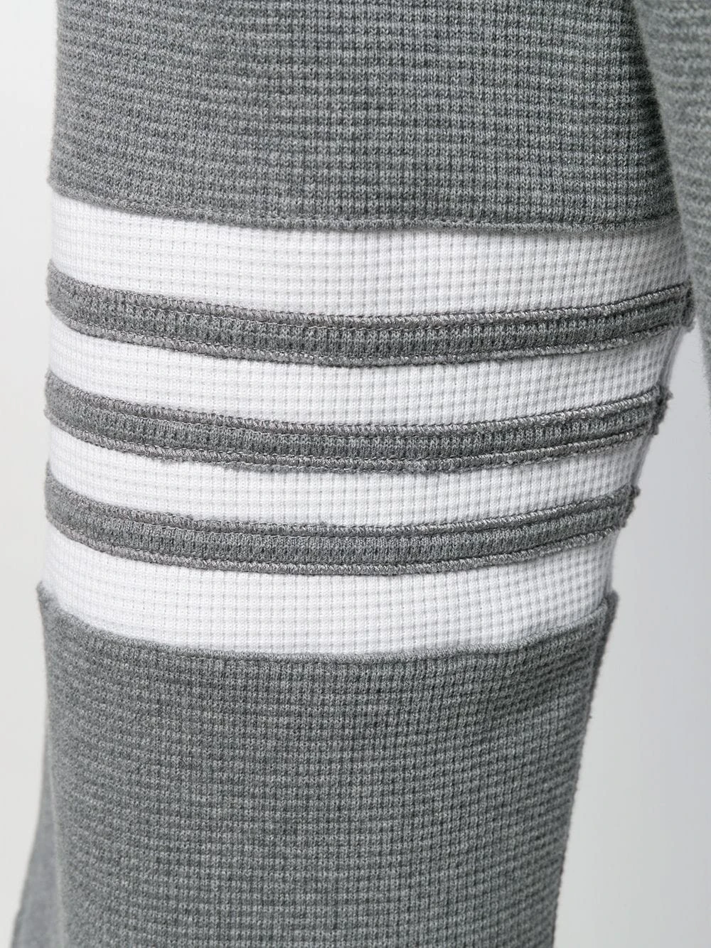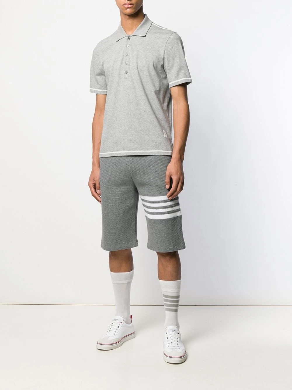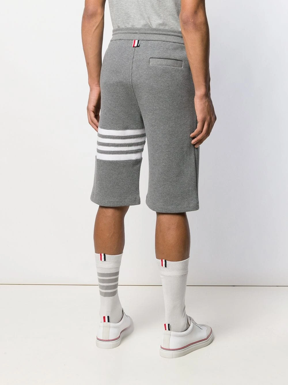 Thom Browneβs expertise in technical, tailored and luxuriously fabricated aesthetic is clearly evident in these medium grey cotton waffle stitch 4-bar stripe track shorts from Thom Browne. Featuring an elasticated drawstring waist, side seam pockets, a back pocket and a 4-bar stripe detail.
