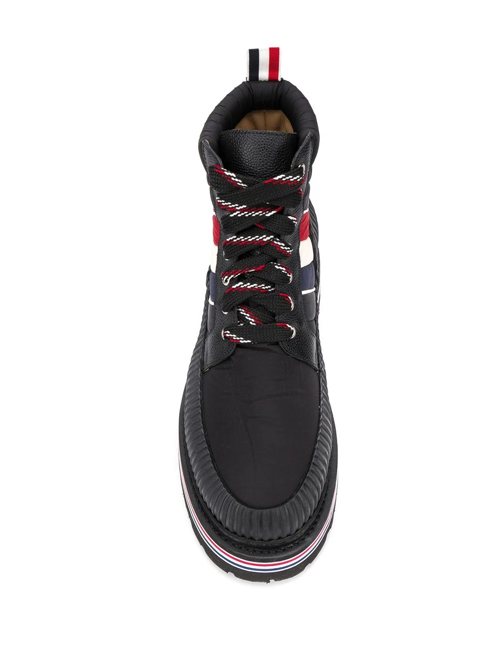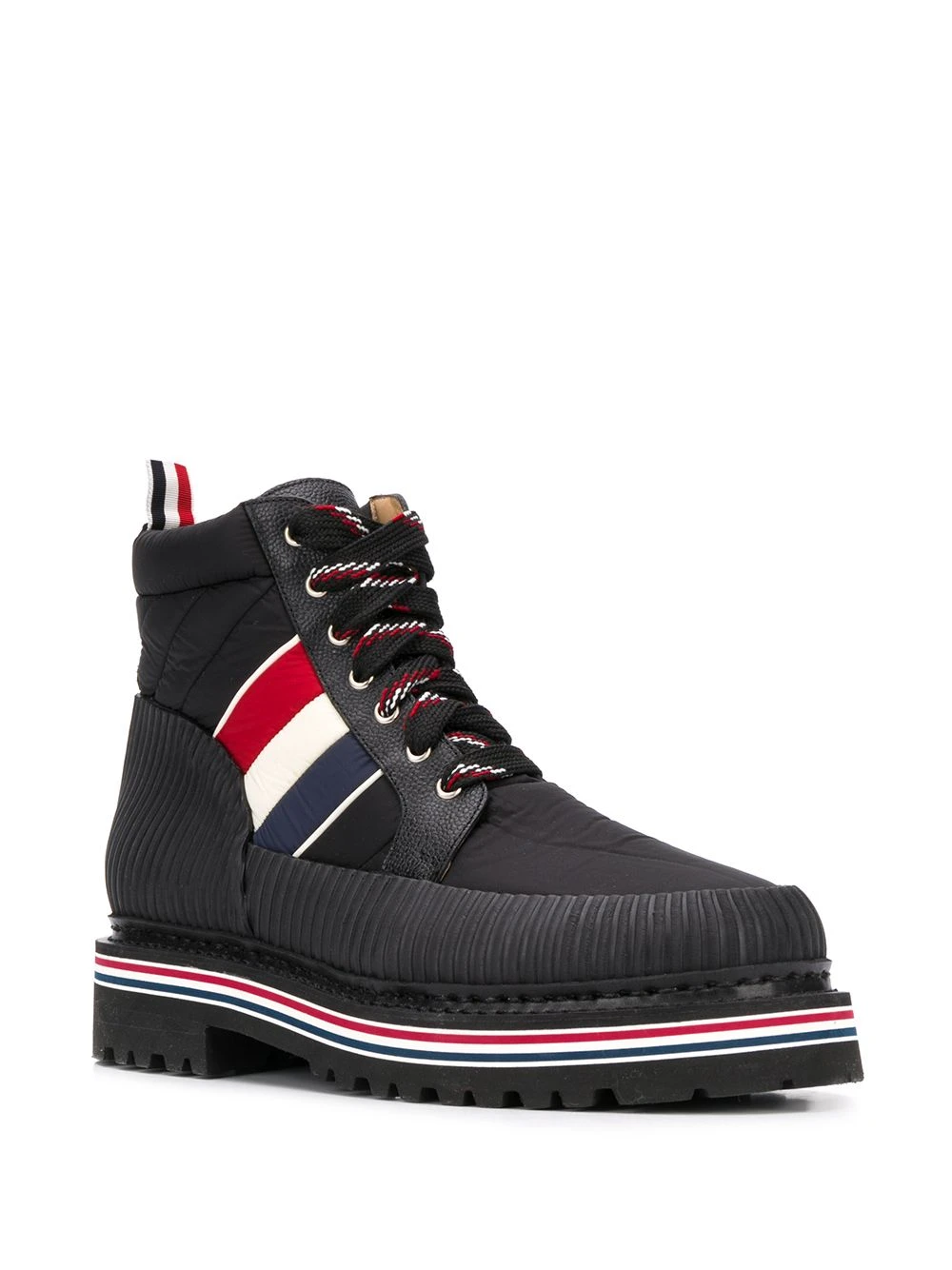 Cover sound ground in Thom Browne. In classic black, these all terrain tricolour stripe ankle boots are accented with ribbed detailing and padded ankles. Sturdy, these boots will go the extra mile. Featuring a round toe, a ribbed design, a quilted effect, a leather trim, a lace-up front fastening, a pull tab at the rear and a ridged rubber sole.