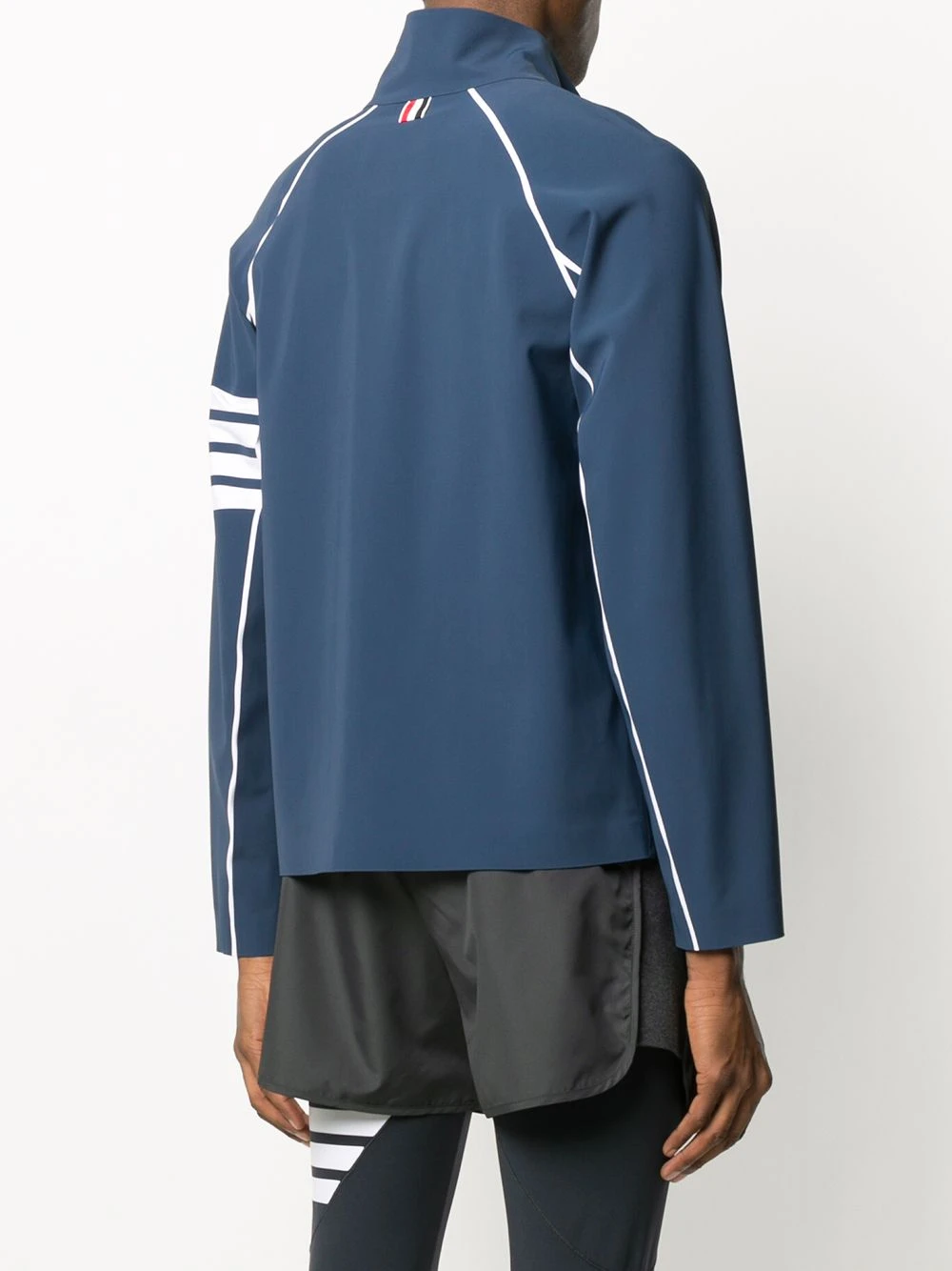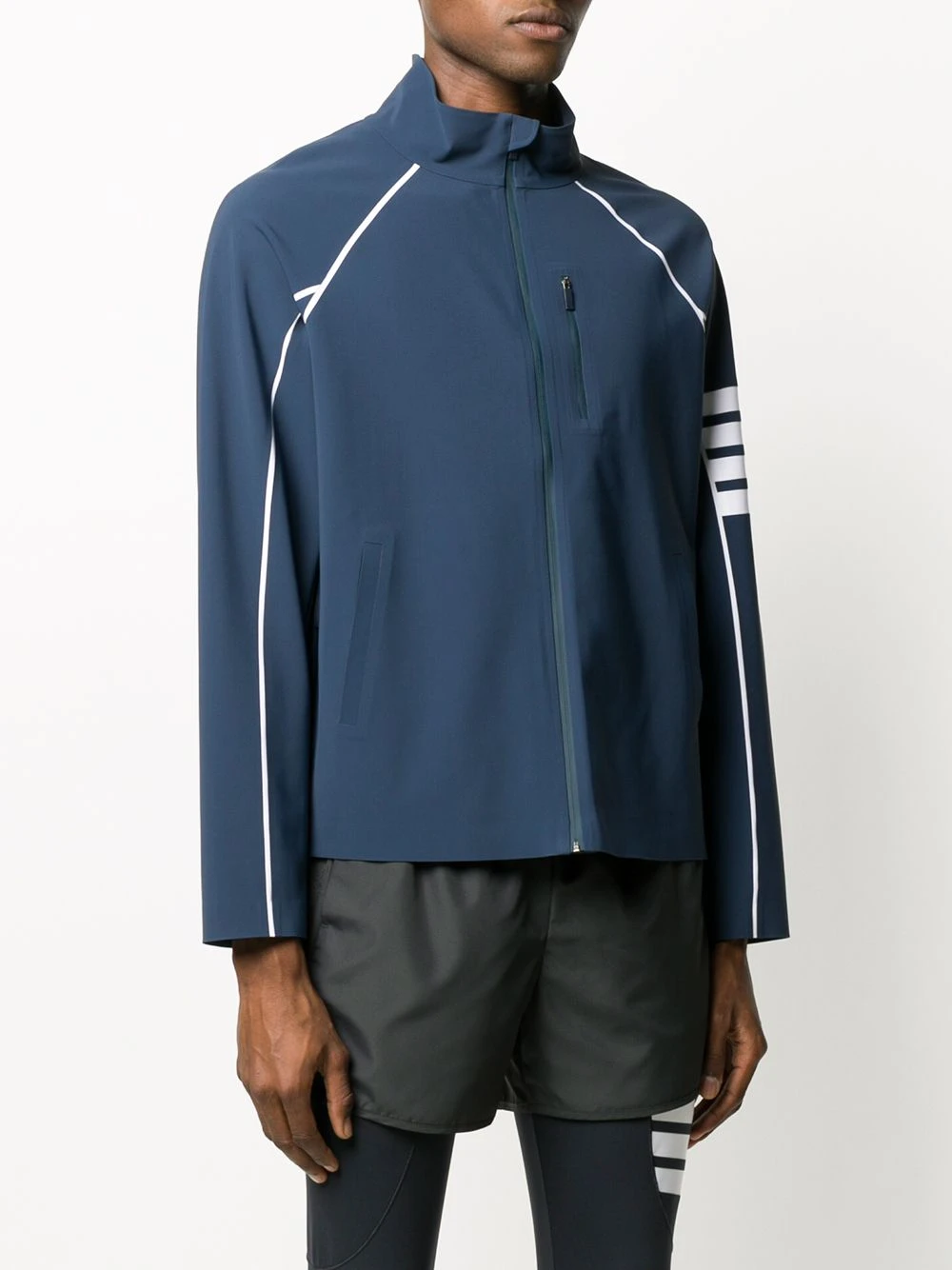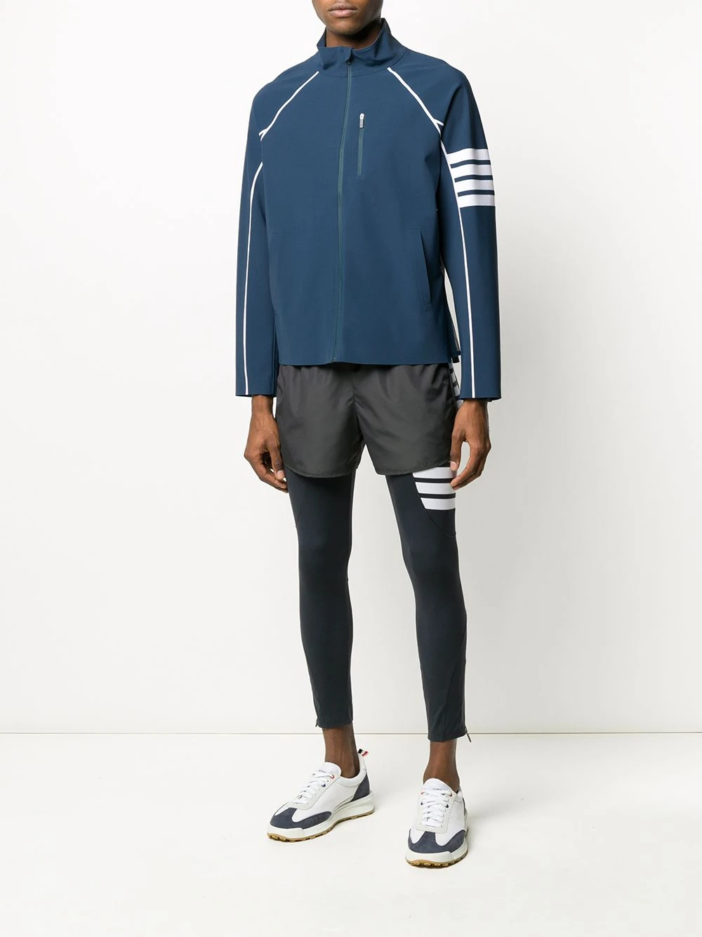 Four strikes and you’re Thom Browne. Showcasing the signature 4-Bar stripe detailing to the sleeve, this lightweight tech jacket is part of Thom Browne’s innovative activewear collection, ensuring ultimate style whilst you work up a sweat. Or nip to the shop. Featuring a stand-up collar, a front zip fastening, long sleeves, a stripe detail to the side, a front zip pocket and side pockets.