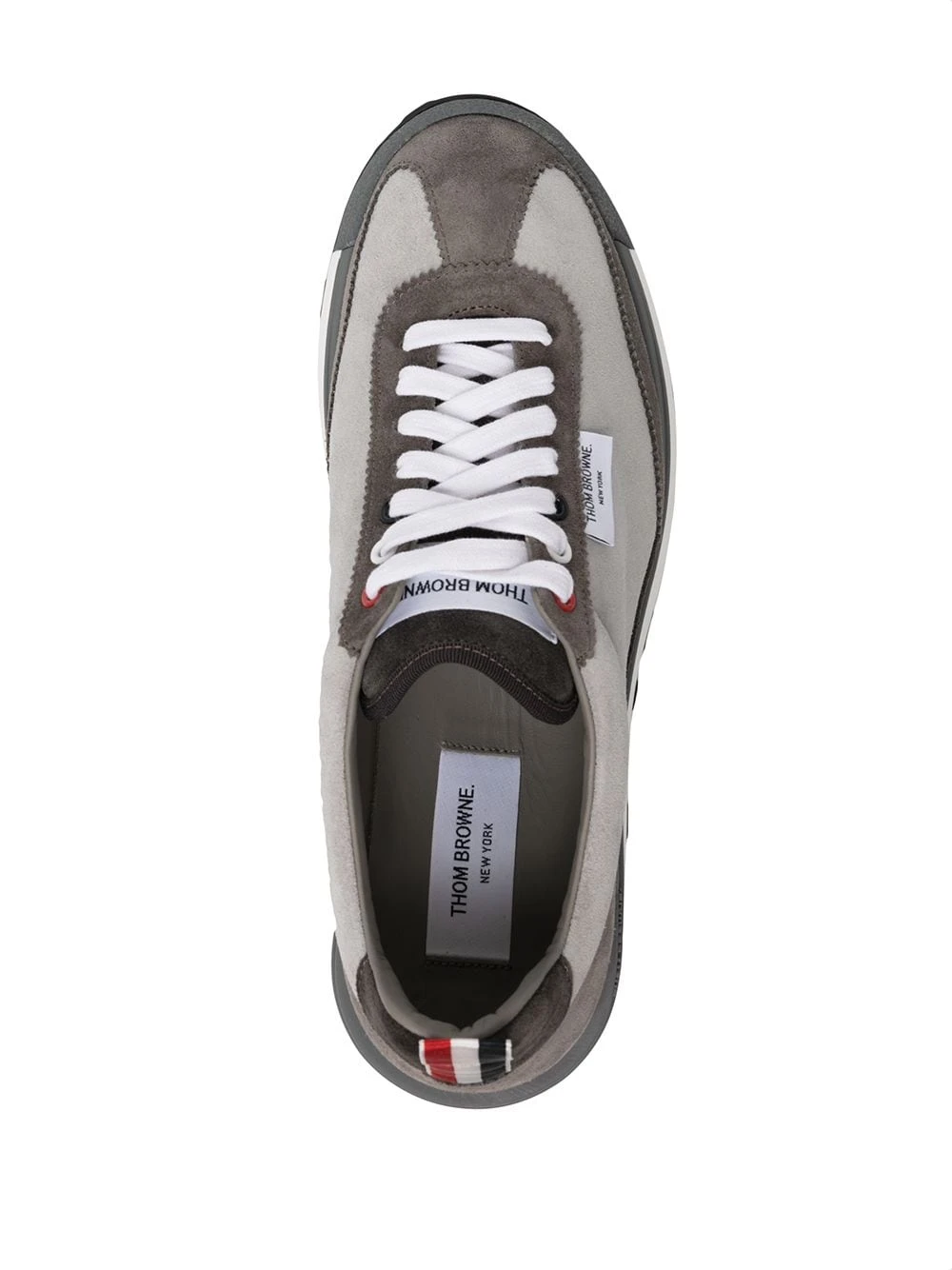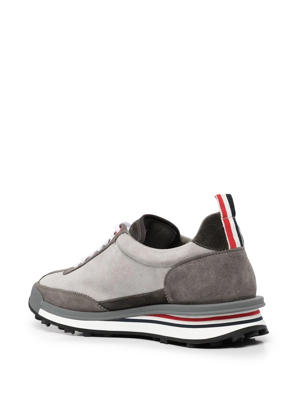 With a neutral palette of grey tones, these lace-up sneakers from Thom Browne have a panelled design. Subtly added to the piece are tricolour detailing in red, navy blue and white, one of the brandβs main symbols.