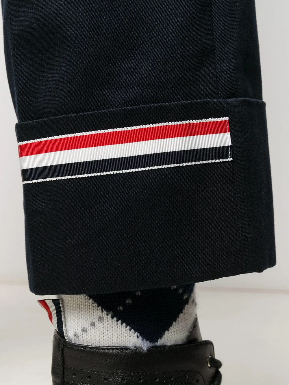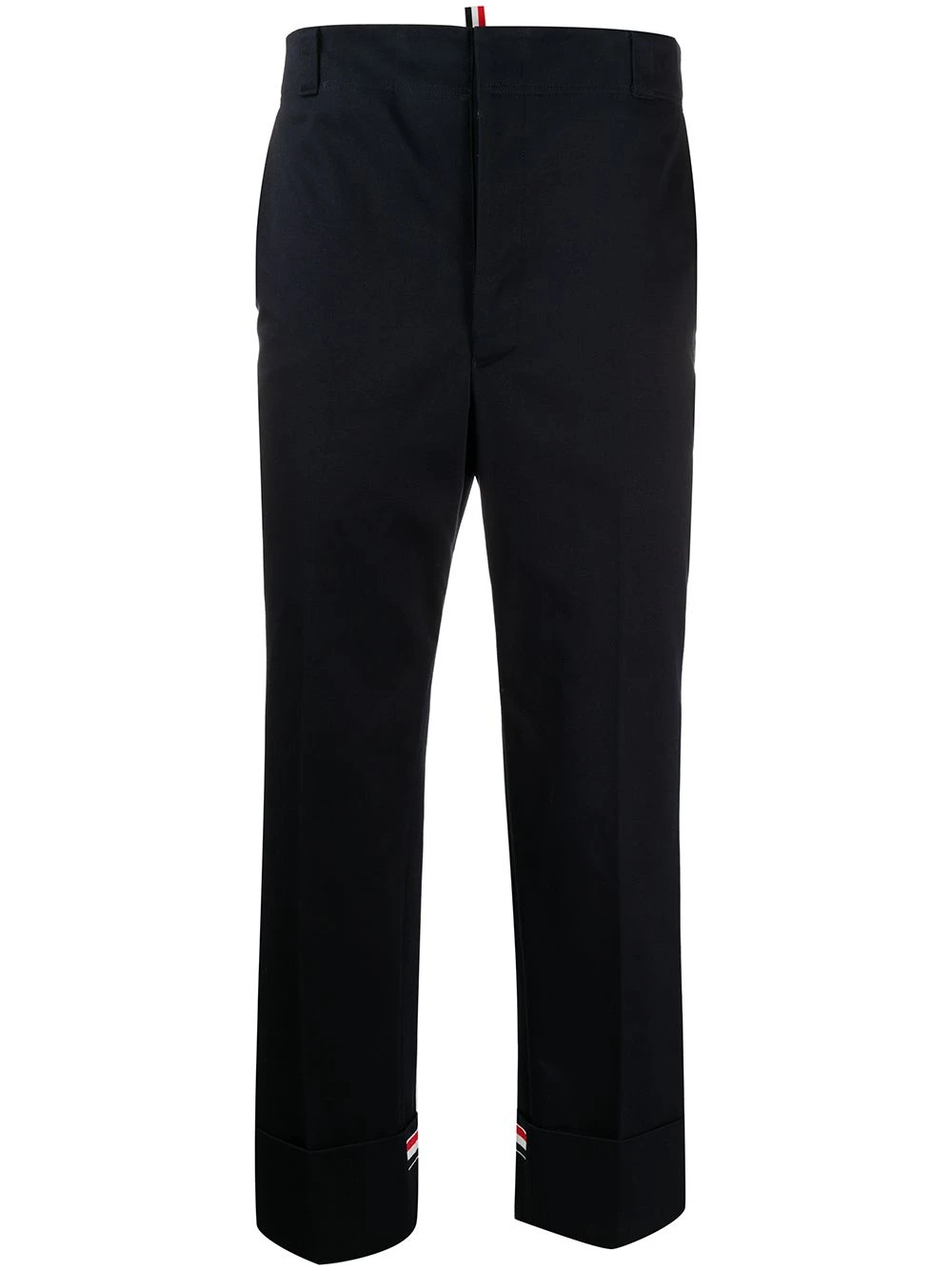Life is a bit like a chess game. You have to create your own strategy in order to win the (other) king. Get ready for the “checkmate” moment with these navy trousers from Thom Browne. Looks like we have a winner. Featuring a concealed front fastening, side pockets, rear welt pockets, a cropped length and signature striped trims.