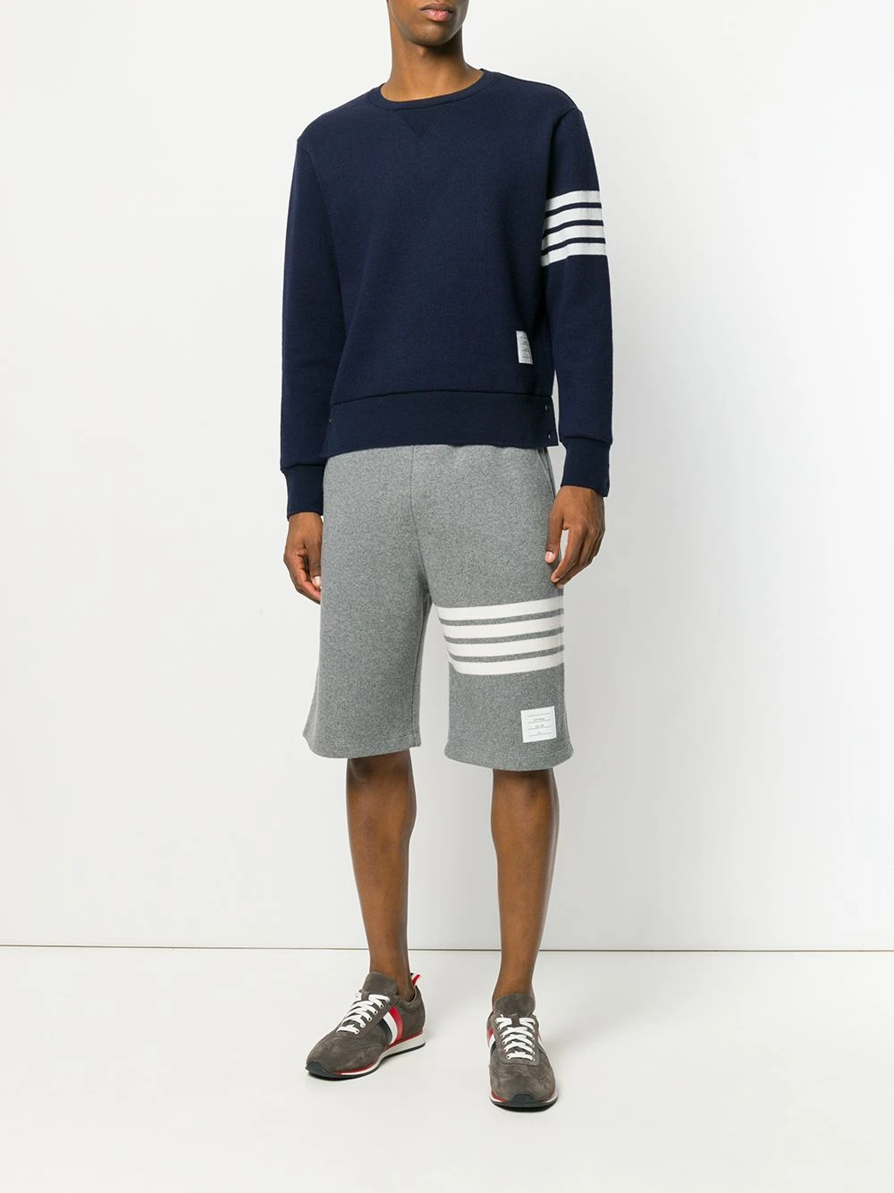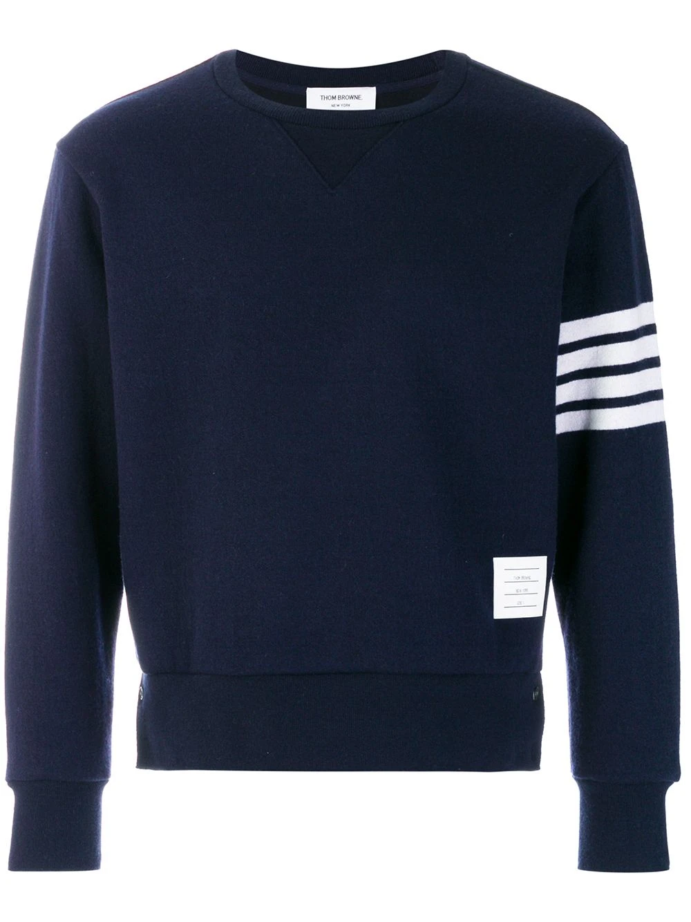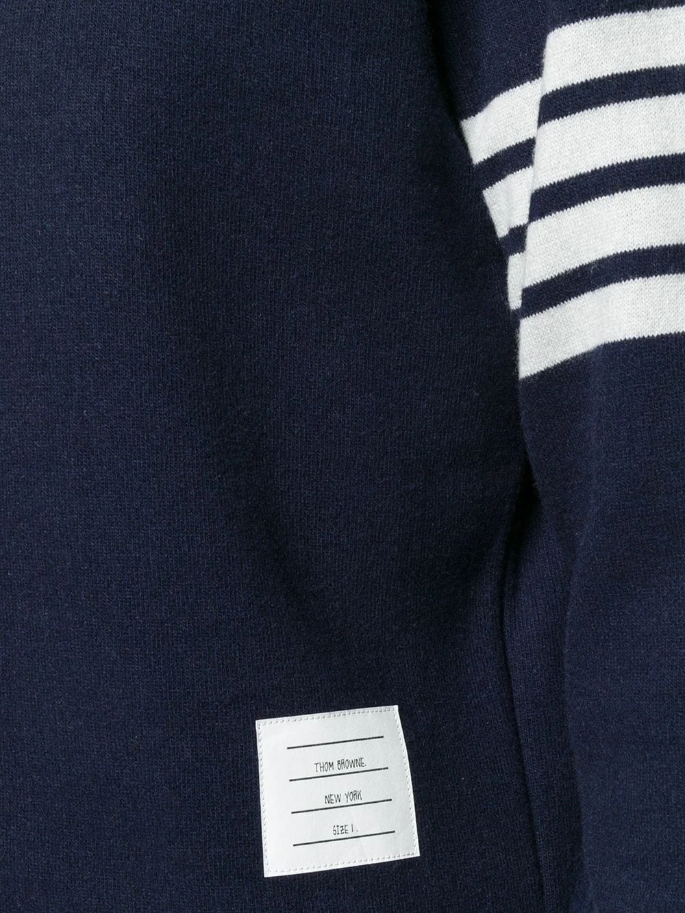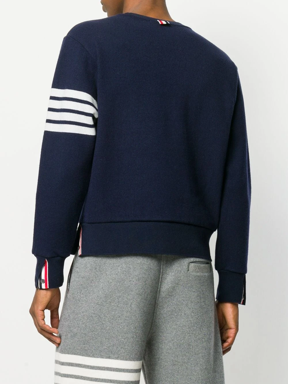 Navy blue 4-Bar Cashmere Shell Sweatshirt from Thom Browne featuring a crew neck, long sleeves, button cuffs, a front logo patch, an elasticated hem, a relaxed fit, buttoned side slits and four white stripes to the left sleeve.