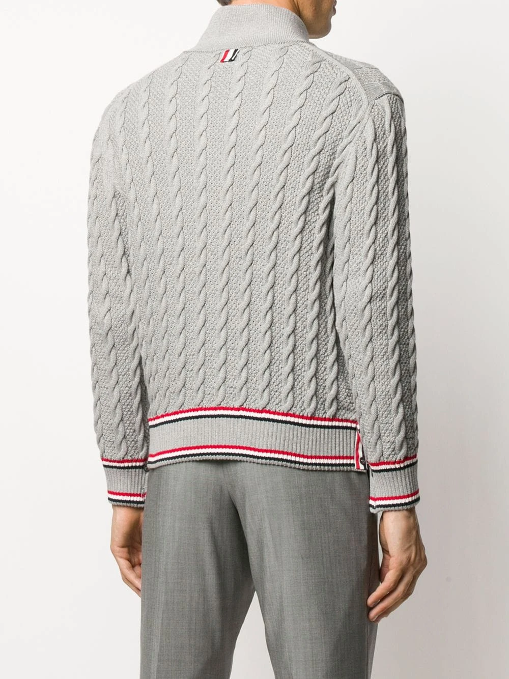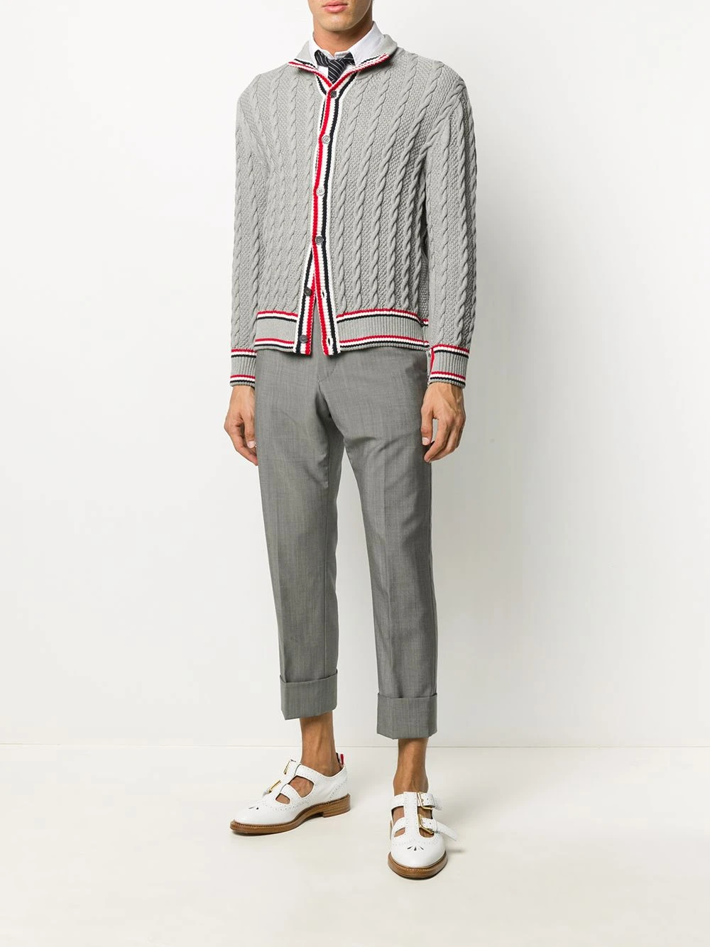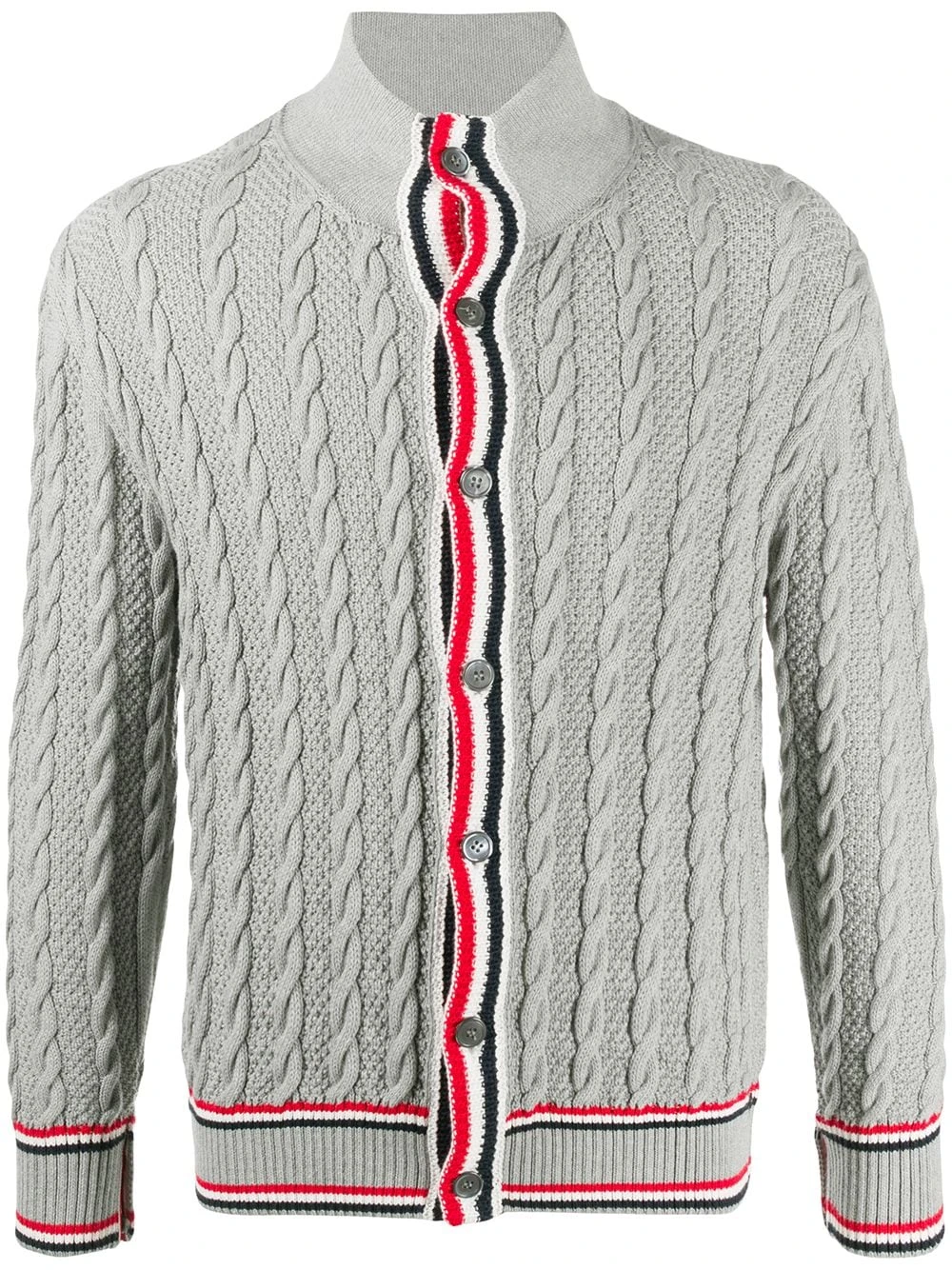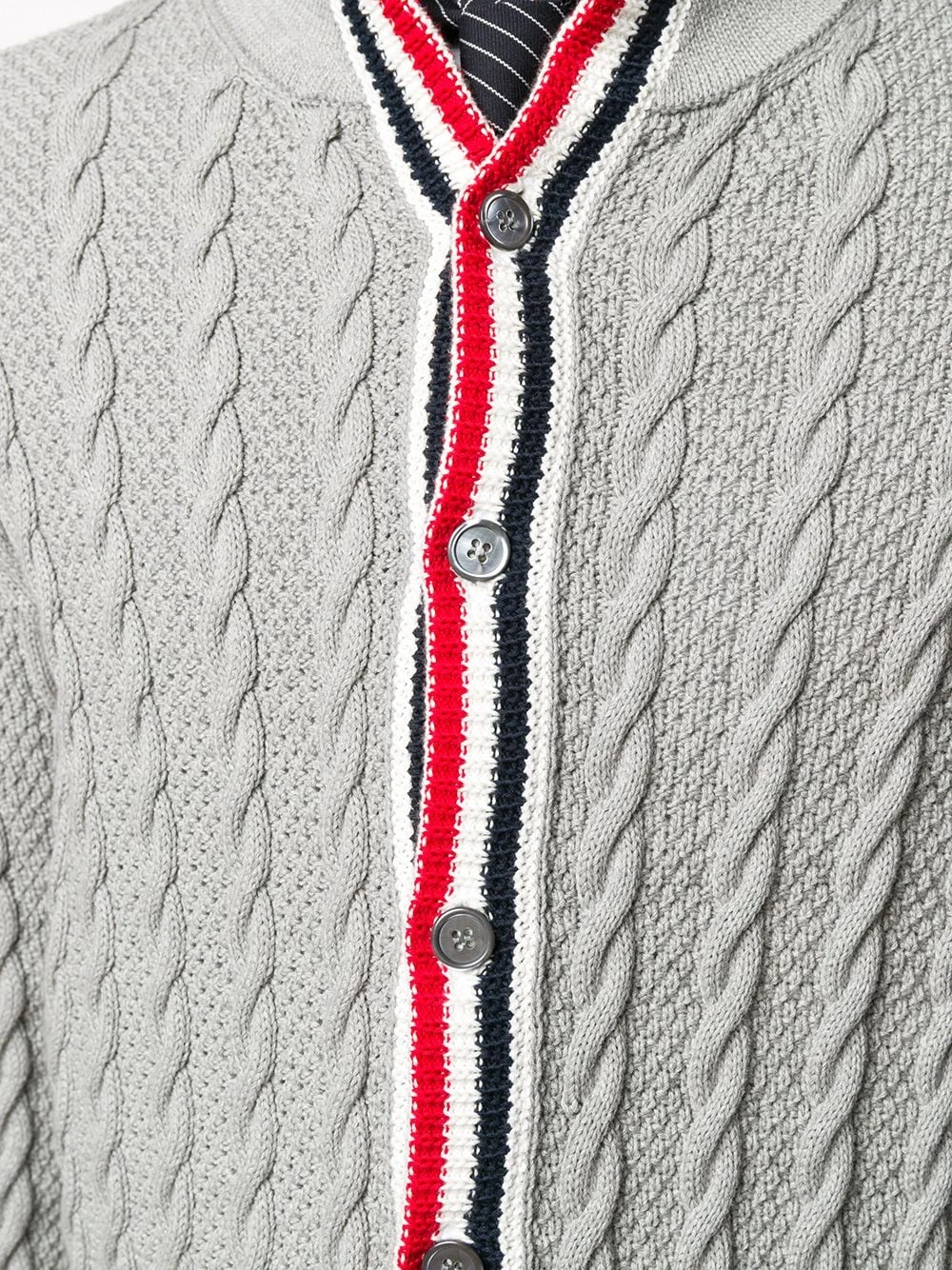 Keep calm in cable knit. Quintessentially cooler days call for this grey Thom Browne cardigan. You’re pushing all the right buttons.