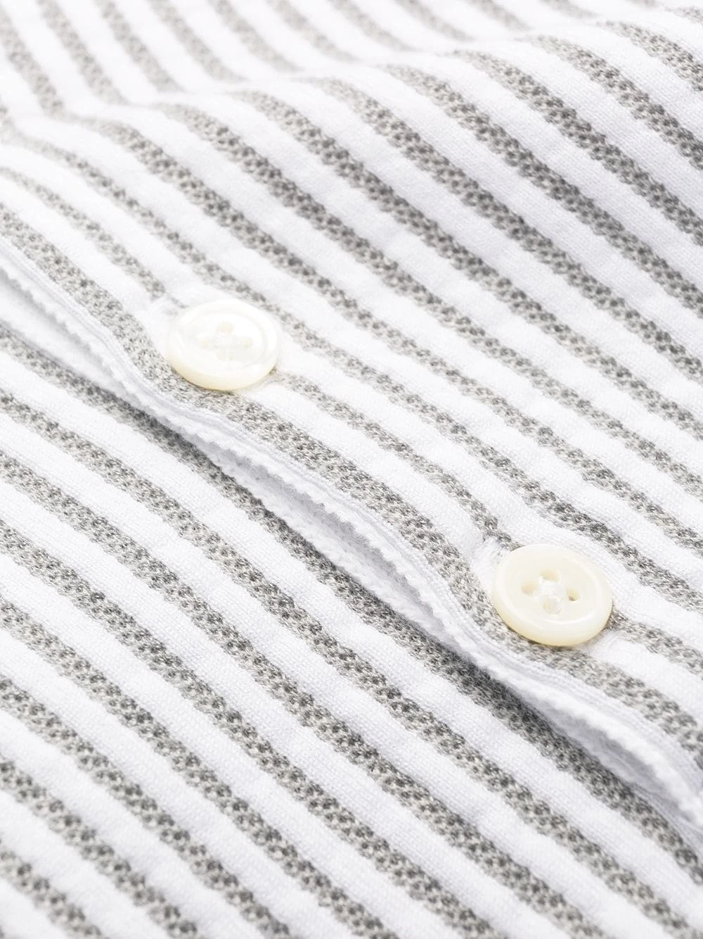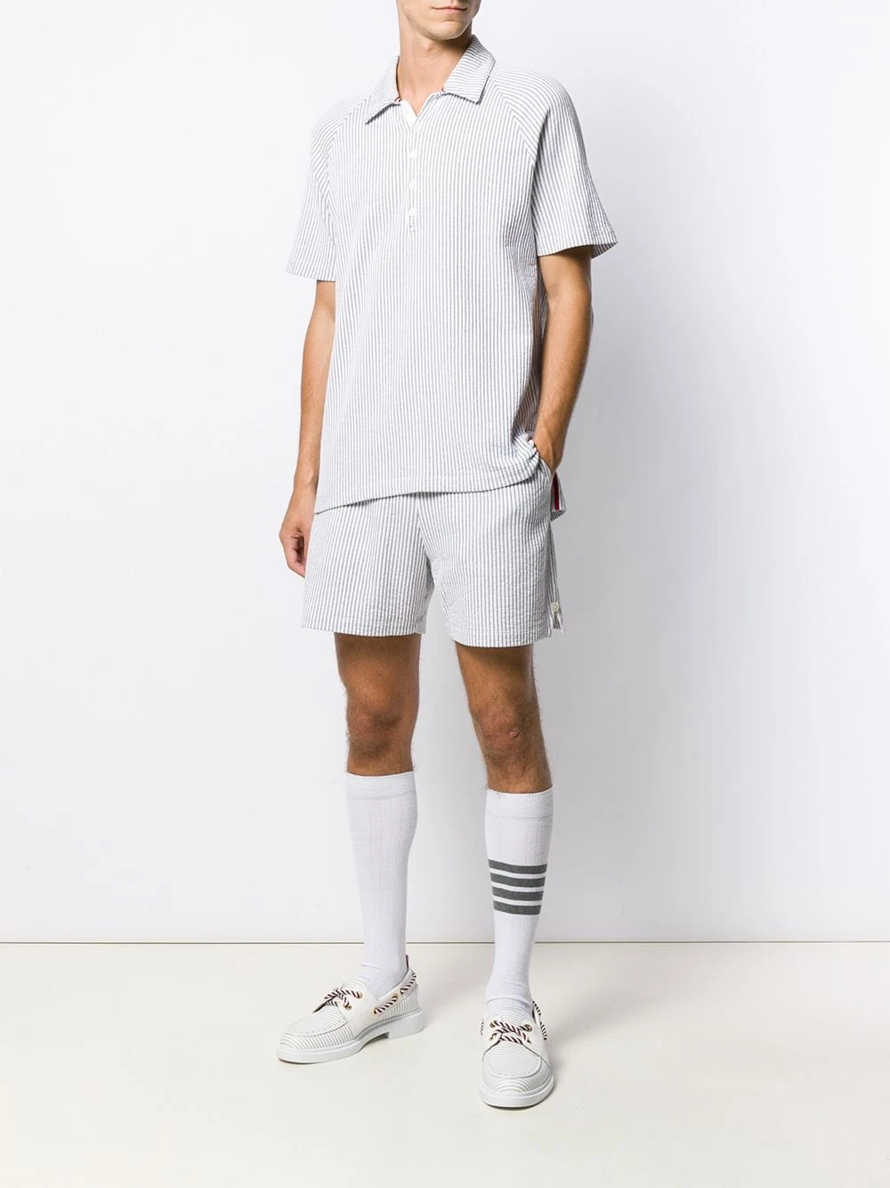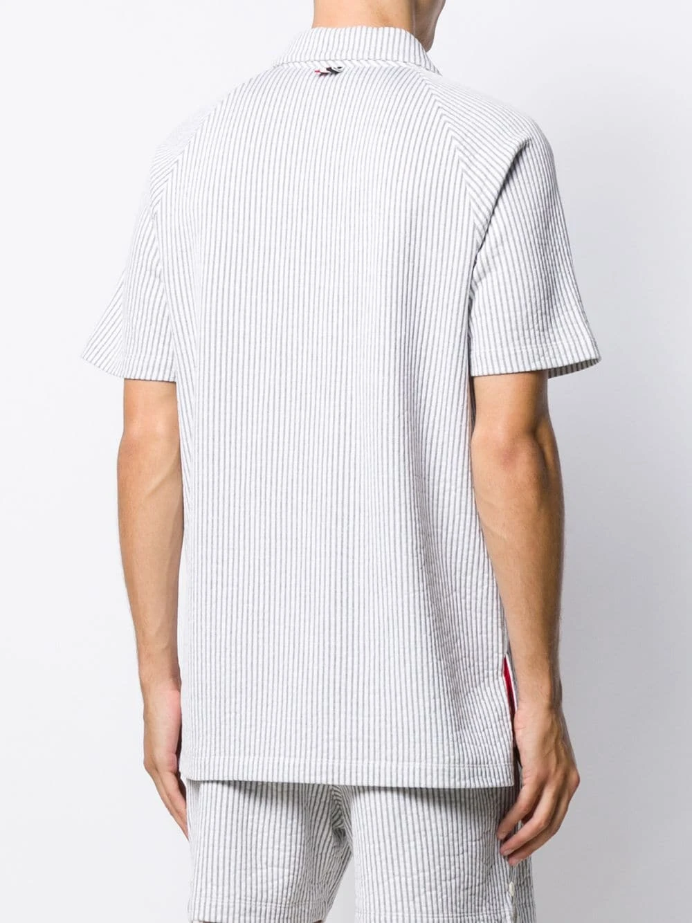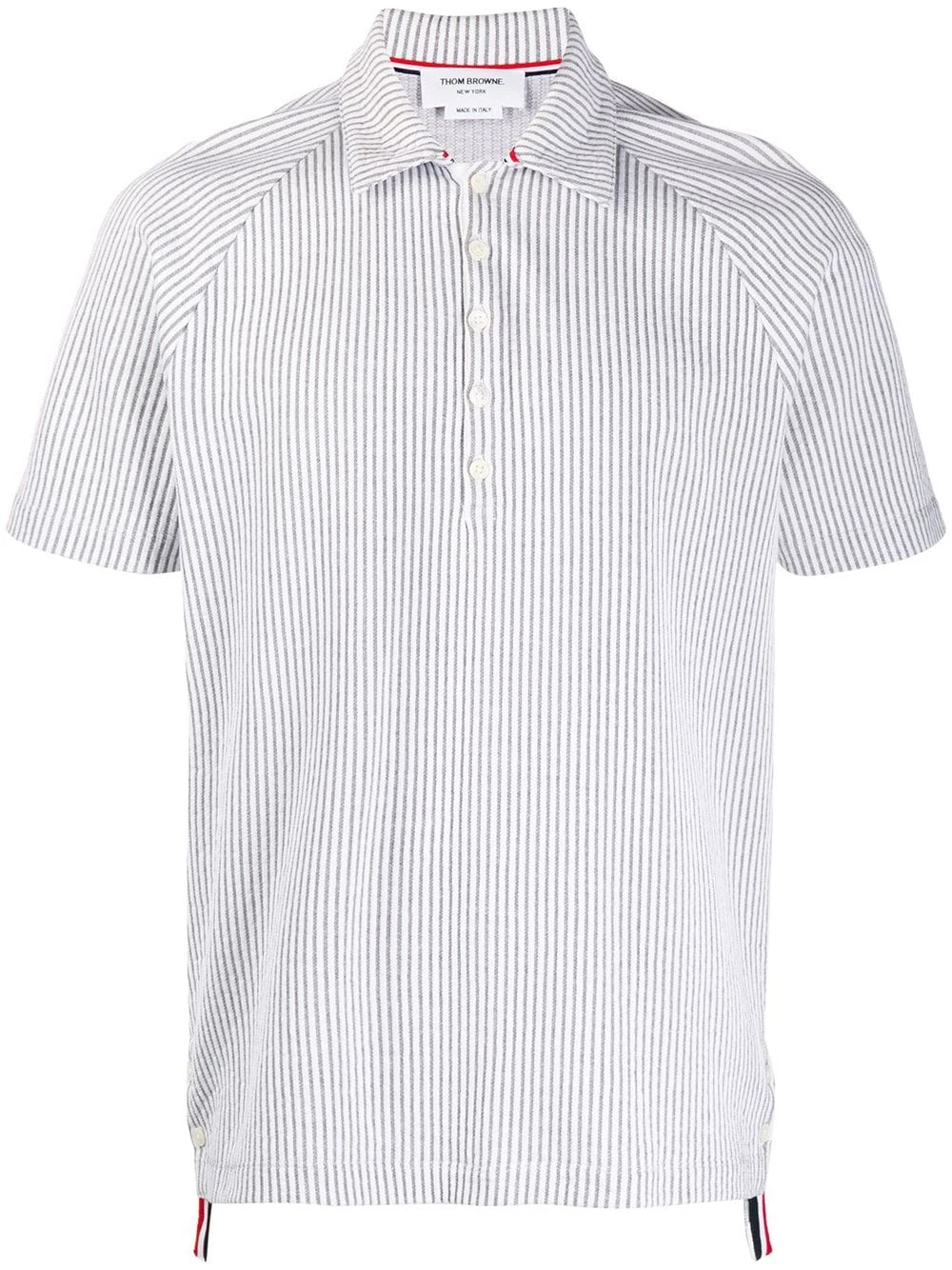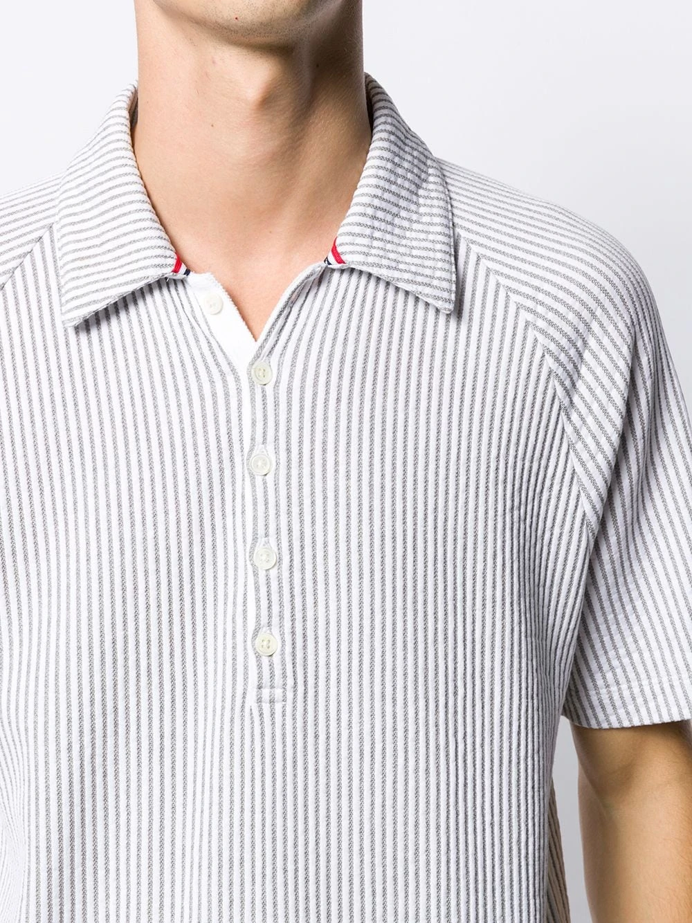 Looking for classic wardrobe pieces with a distinctive edge? Thom Browne will give you an easy route, as seen in this light grey and white cotton seersucker raglan sleeve polo shirt. Featuring a front button placket, short sleeves, a classic collar, button details at the waist and a contrasting grosgrain tab at the rear.