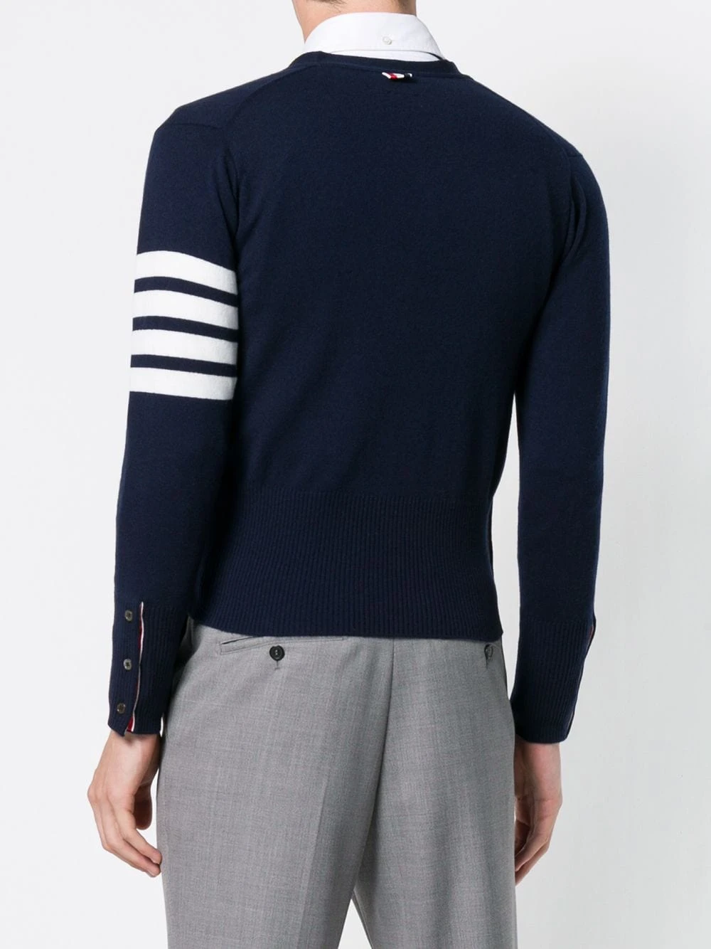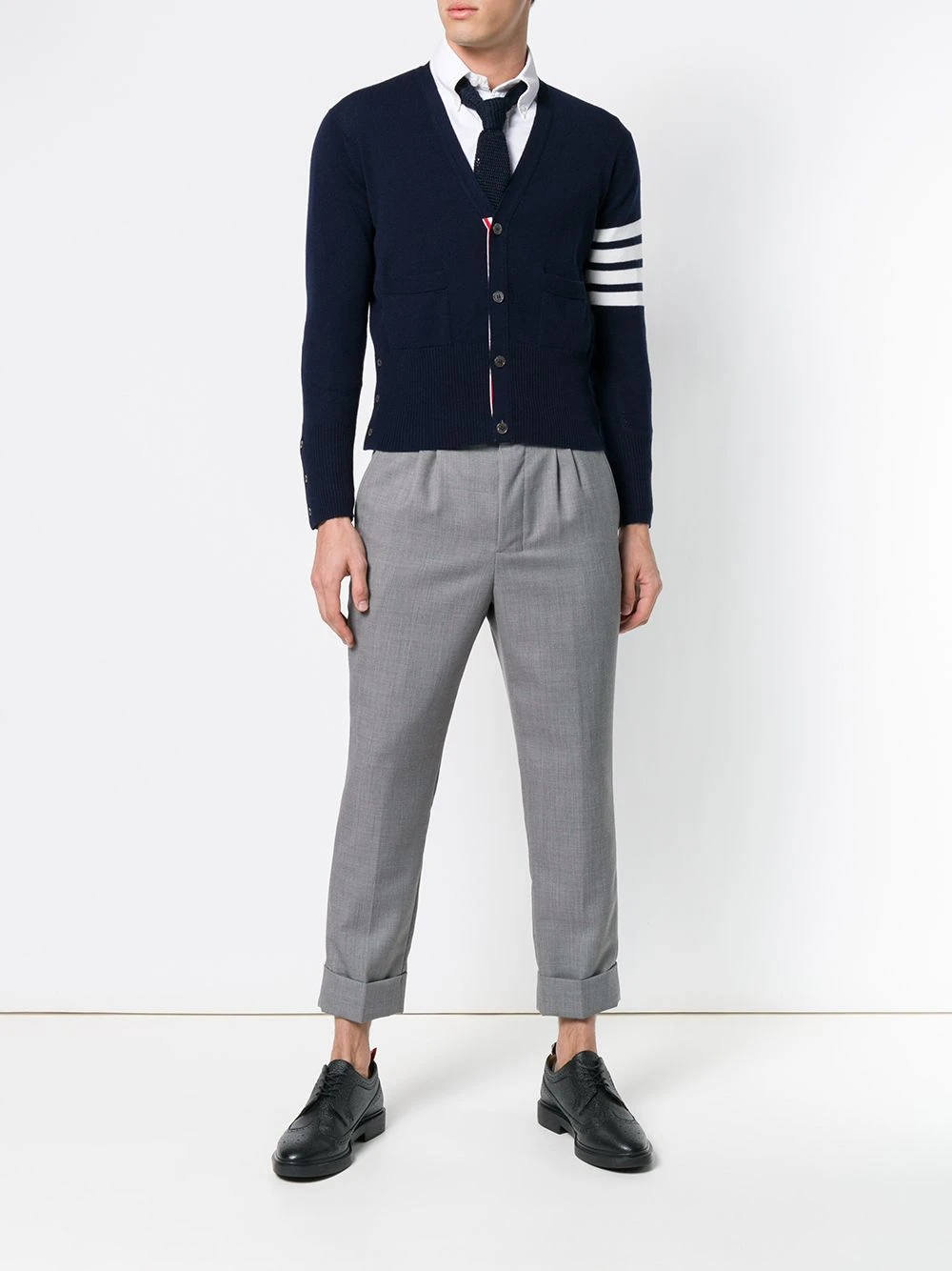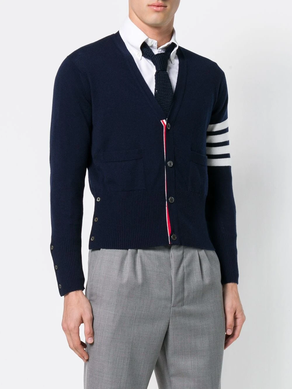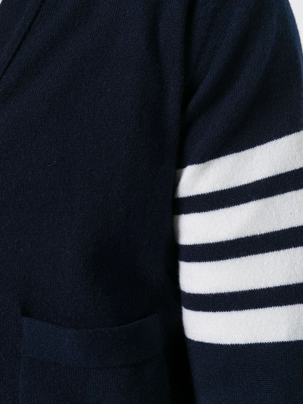 Navy and white cashmere striped sleeve cardigan from Thom Browne.